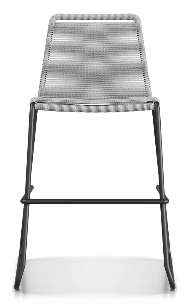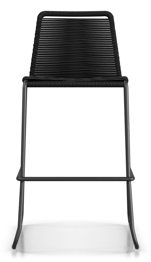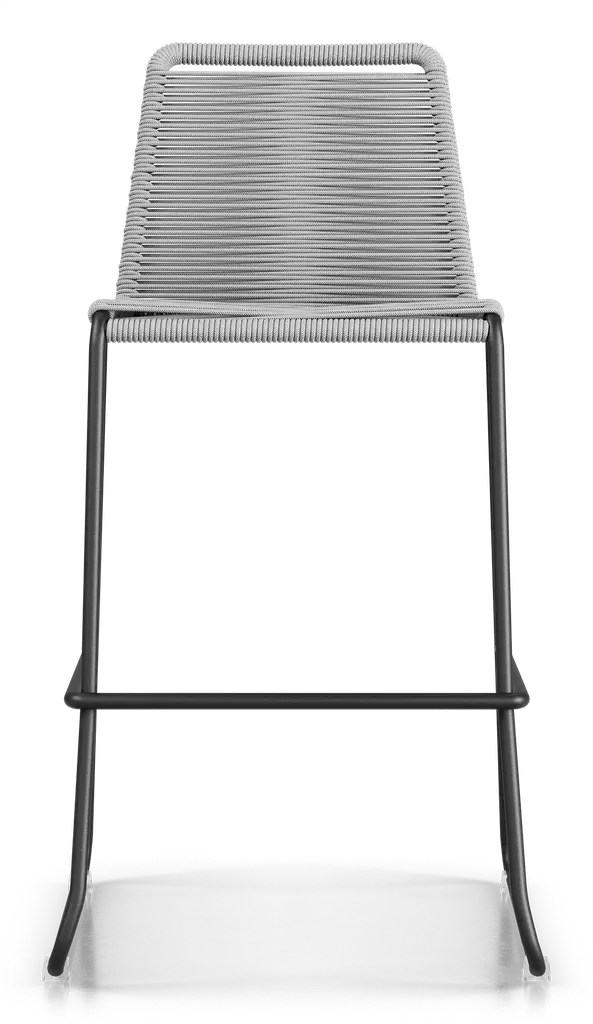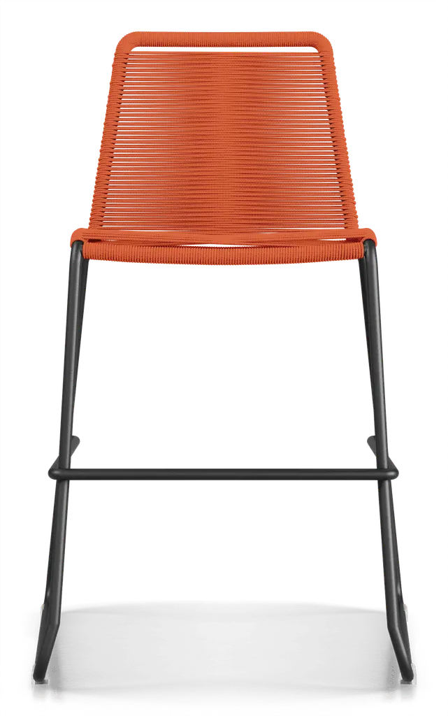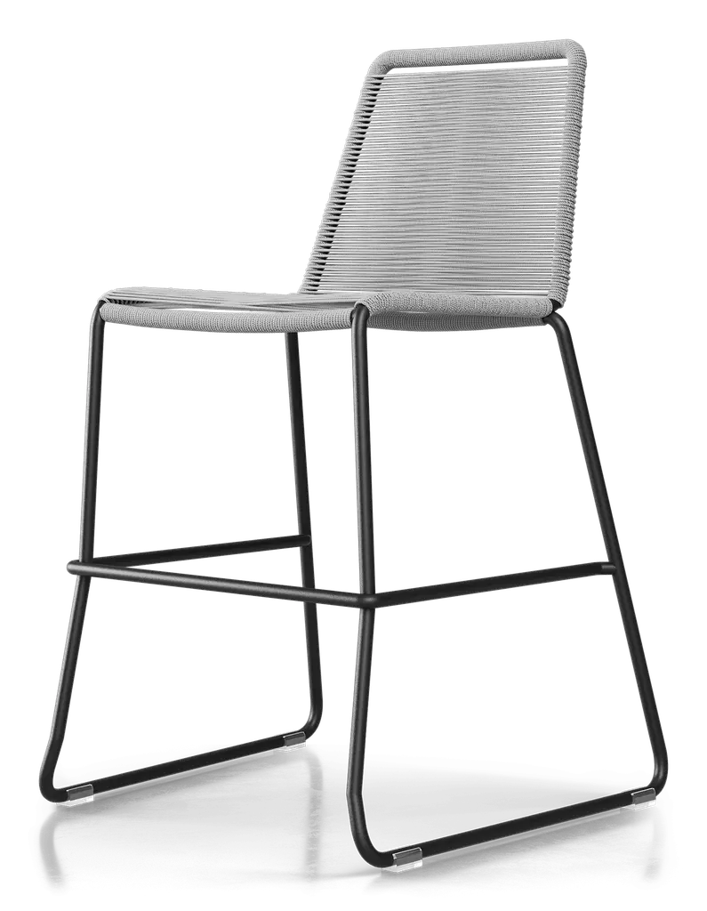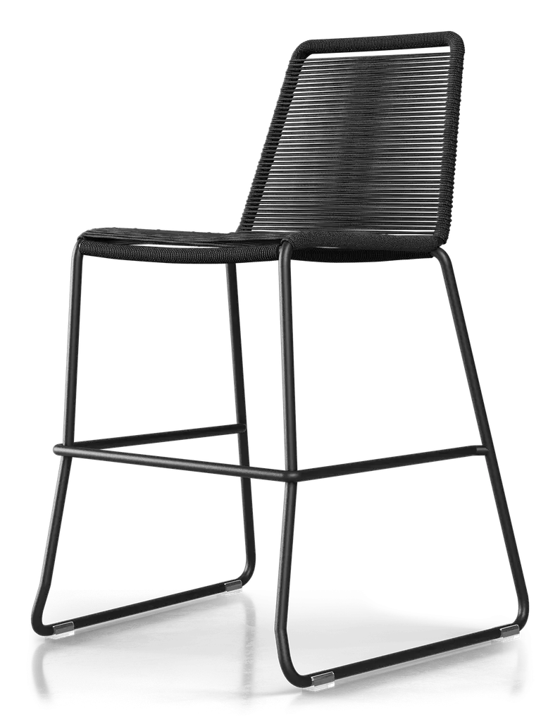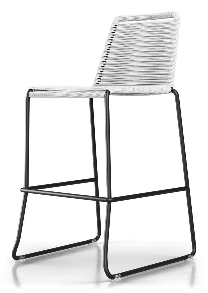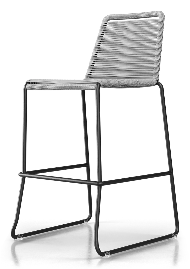 Rope chairs are staples in any seasonal entertaining arsenal. The new Barclay rope barstool makes a case for year round use. Lightweight and comfortable, they're easy to move around, stackable to save space, and they allow in a breeze for cooling. For use indoors and out, the soft UV coated nyon cords are hand dyed resulting in subtle tonal variations. With classic midcentury design, featuring mid-back height and three-side footrests plus a black powder-coated steel frame, the Barclay is available in a range of premium double braided spun polyester cord colors. Bar or counter height options. Suitable for commercial and contract use.