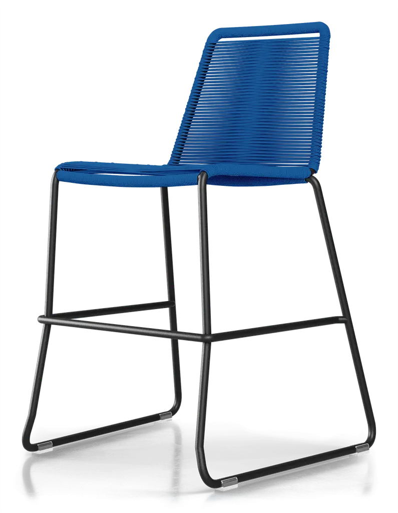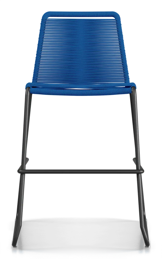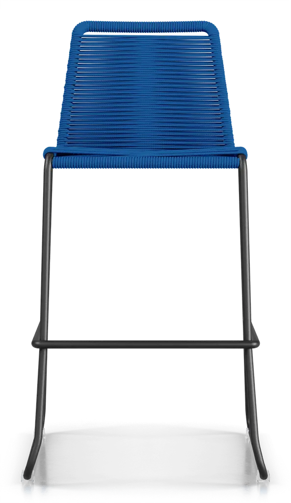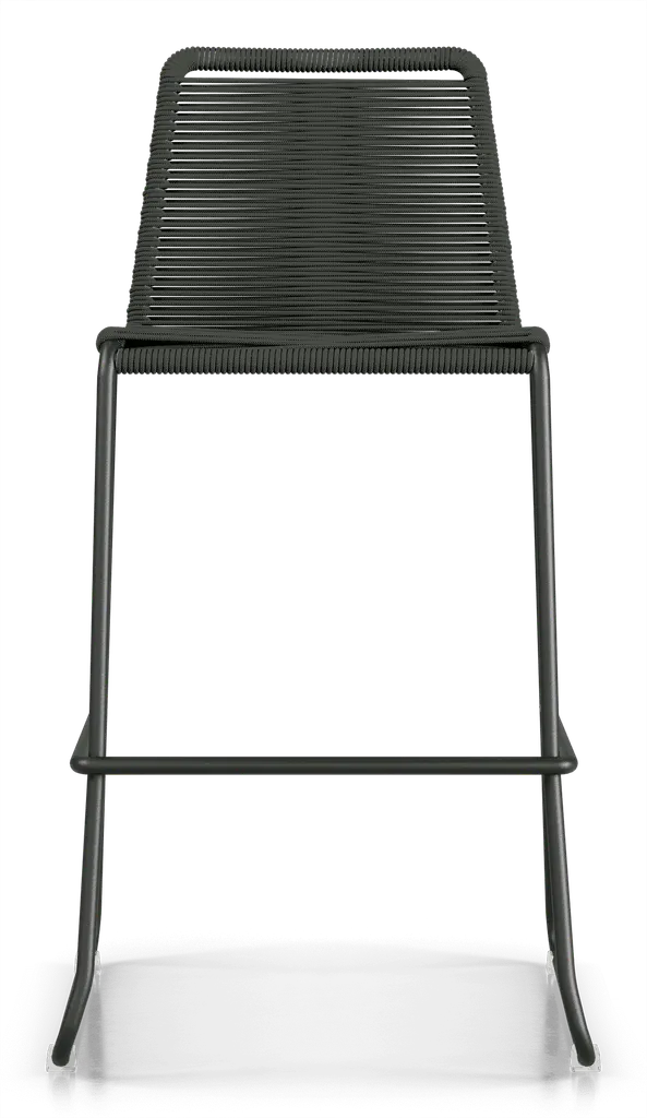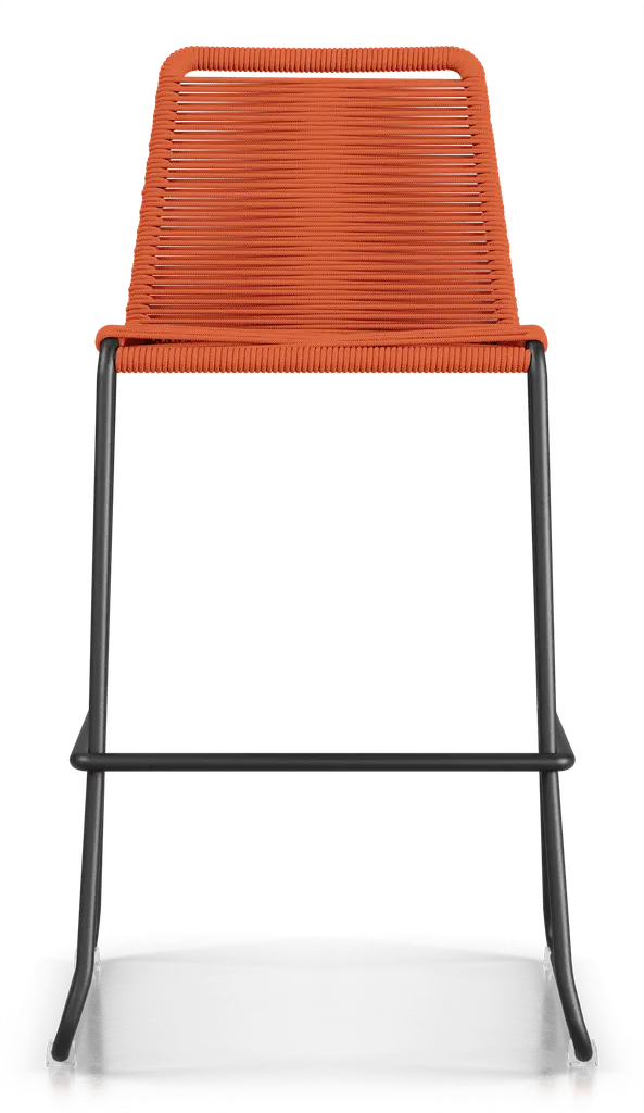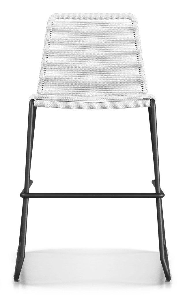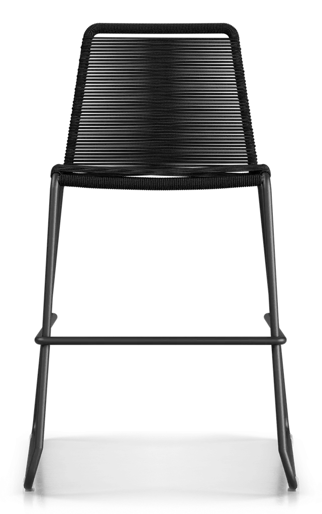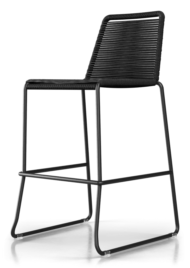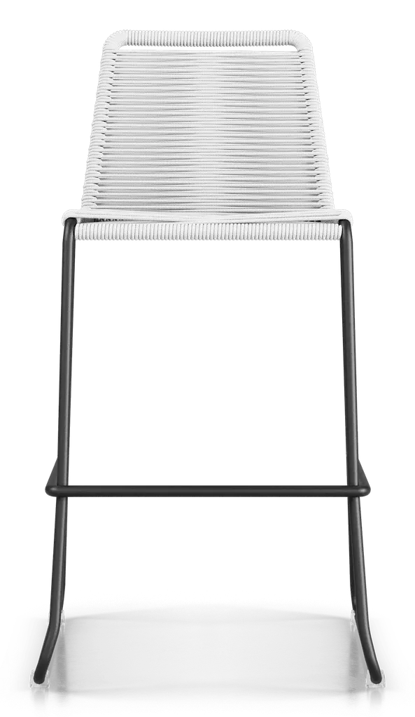 Rope chairs are staples in any seasonal entertaining arsenal. The new Barclay rope barstool makes a case for year round use. Lightweight and comfortable, they're easy to move around, stackable to save space, and they allow in a breeze for cooling. For use indoors and out, the soft UV coated nyon cords are hand dyed resulting in subtle tonal variations. With classic midcentury design, featuring mid-back height and three-side footrests plus a black powder-coated steel frame, the Barclay is available in a range of premium double braided spun polyester cord colors. Bar or counter height options. Suitable for commercial and contract use.