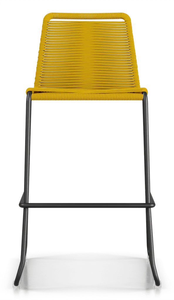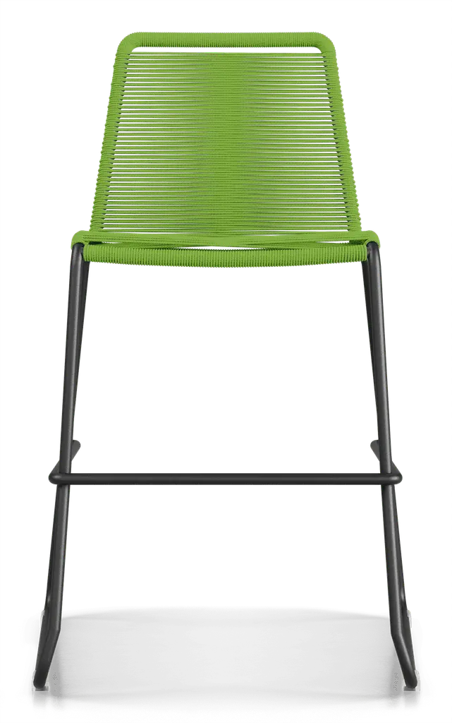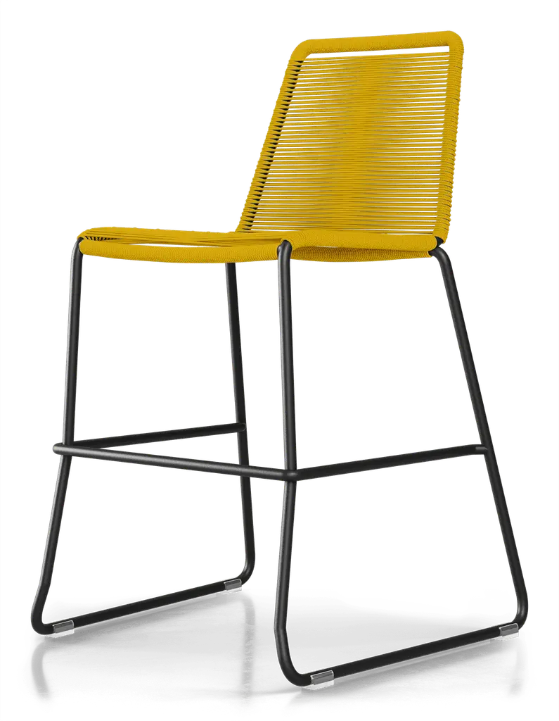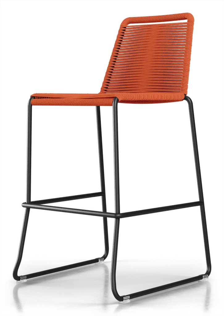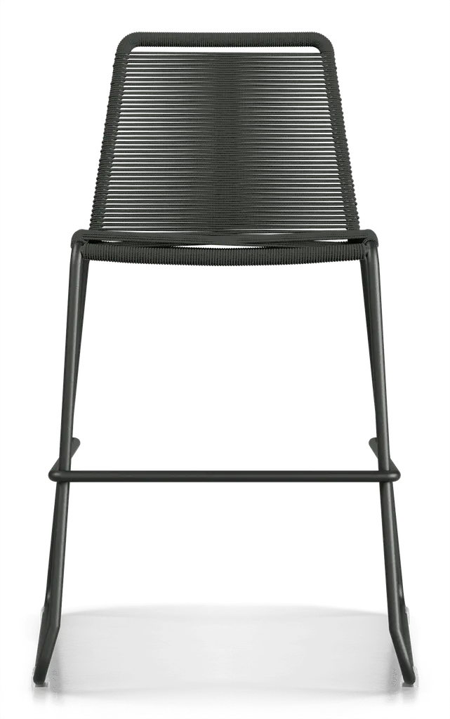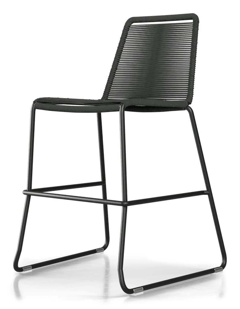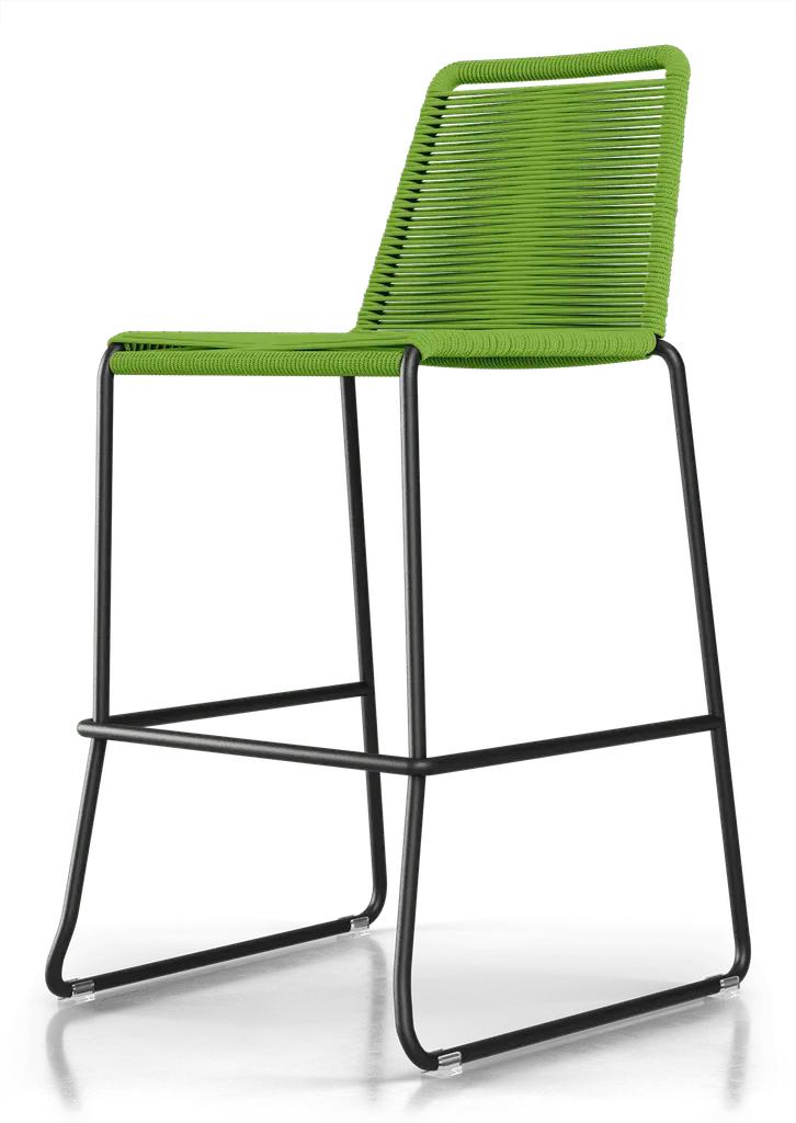 Rope chairs are staples in any seasonal entertaining arsenal. The new Barclay rope barstool makes a case for year round use. Lightweight and comfortable, they're easy to move around, stackable to save space, and they allow in a breeze for cooling. For use indoors and out, the soft UV coated nyon cords are hand dyed resulting in subtle tonal variations. With classic midcentury design, featuring mid-back height and three-side footrests plus a black powder-coated steel frame, the Barclay is available in a range of premium double braided spun polyester cord colors. Bar or counter height options. Suitable for commercial and contract use.