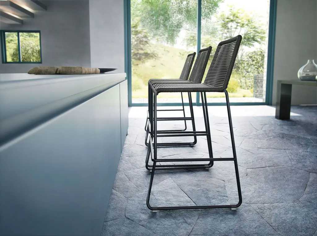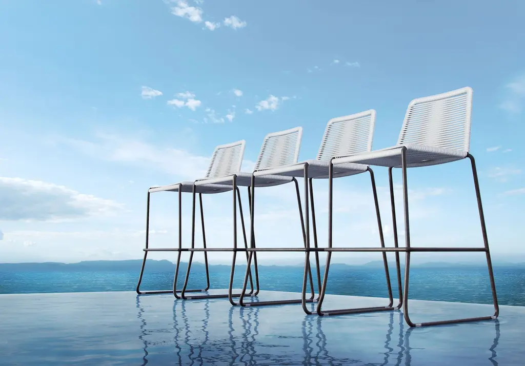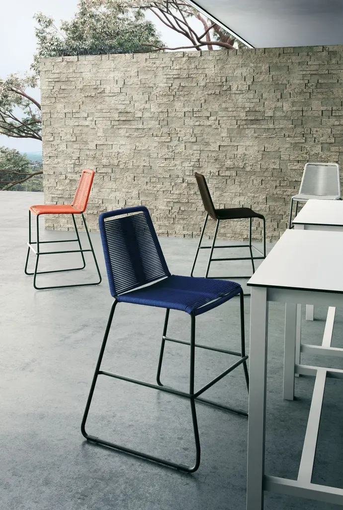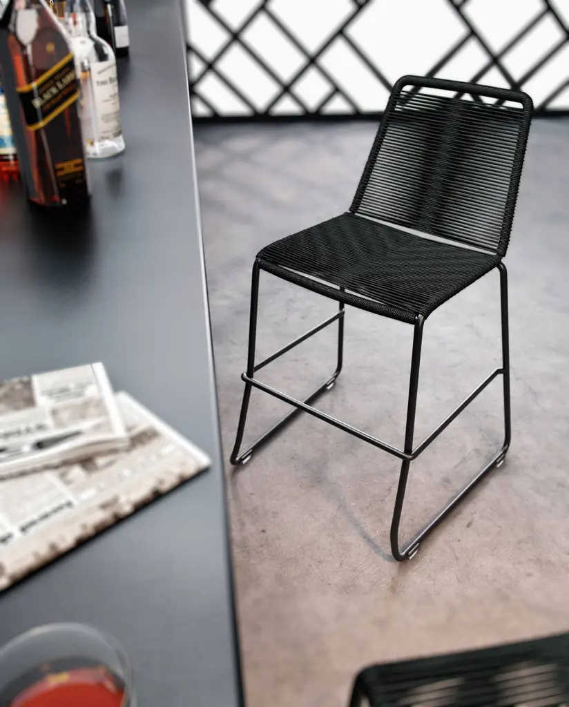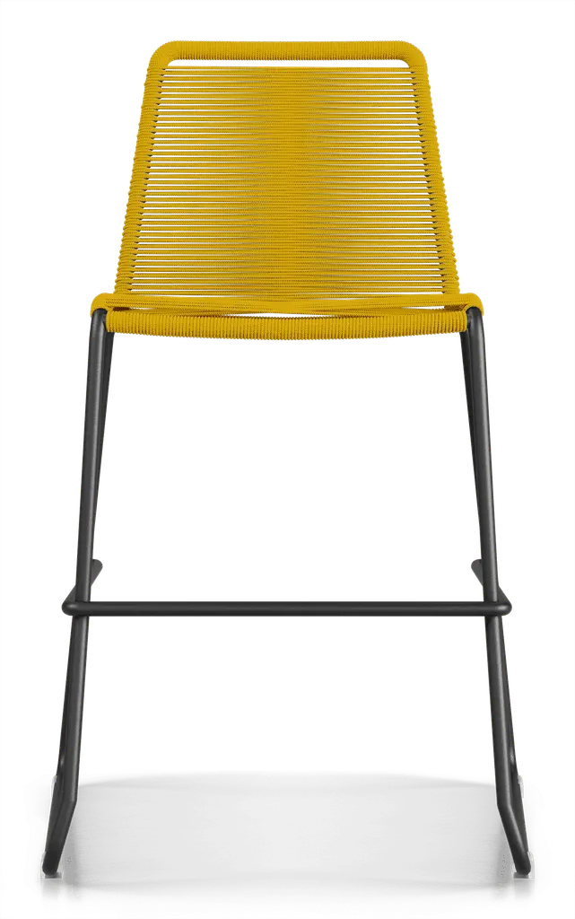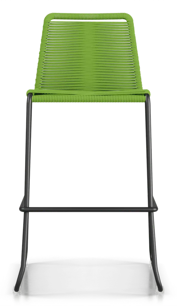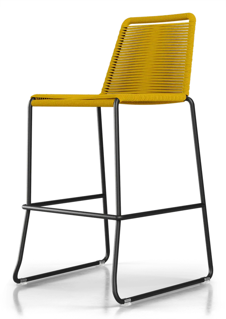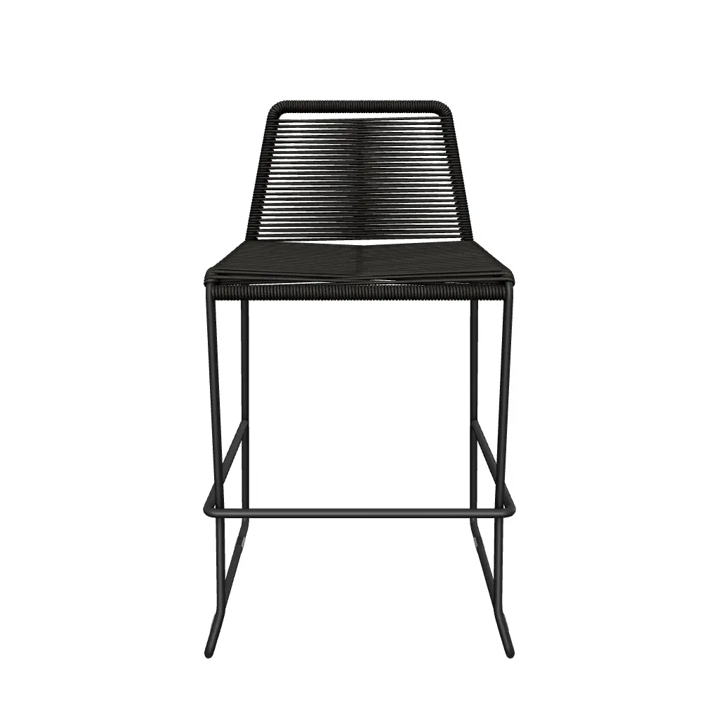 Rope chairs are staples in any seasonal entertaining arsenal. The new Barclay rope barstool makes a case for year round use. Lightweight and comfortable, they're easy to move around, stackable to save space, and they allow in a breeze for cooling. For use indoors and out, the soft UV coated nyon cords are hand dyed resulting in subtle tonal variations. With classic midcentury design, featuring mid-back height and three-side footrests plus a black powder-coated steel frame, the Barclay is available in a range of premium double braided spun polyester cord colors. Bar or counter height options. Suitable for commercial and contract use.