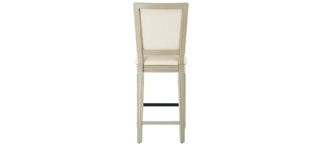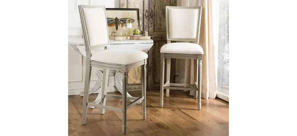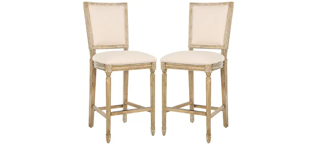 Entertain in style with this Buchanan Bar Stool. Designed to bring French charm to the table, Buchanan's light beige linen is paired with finely carved rustic grey wood. Sold in sets of two.