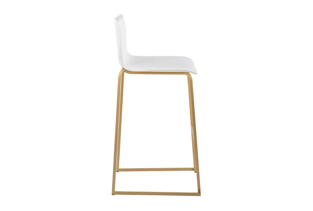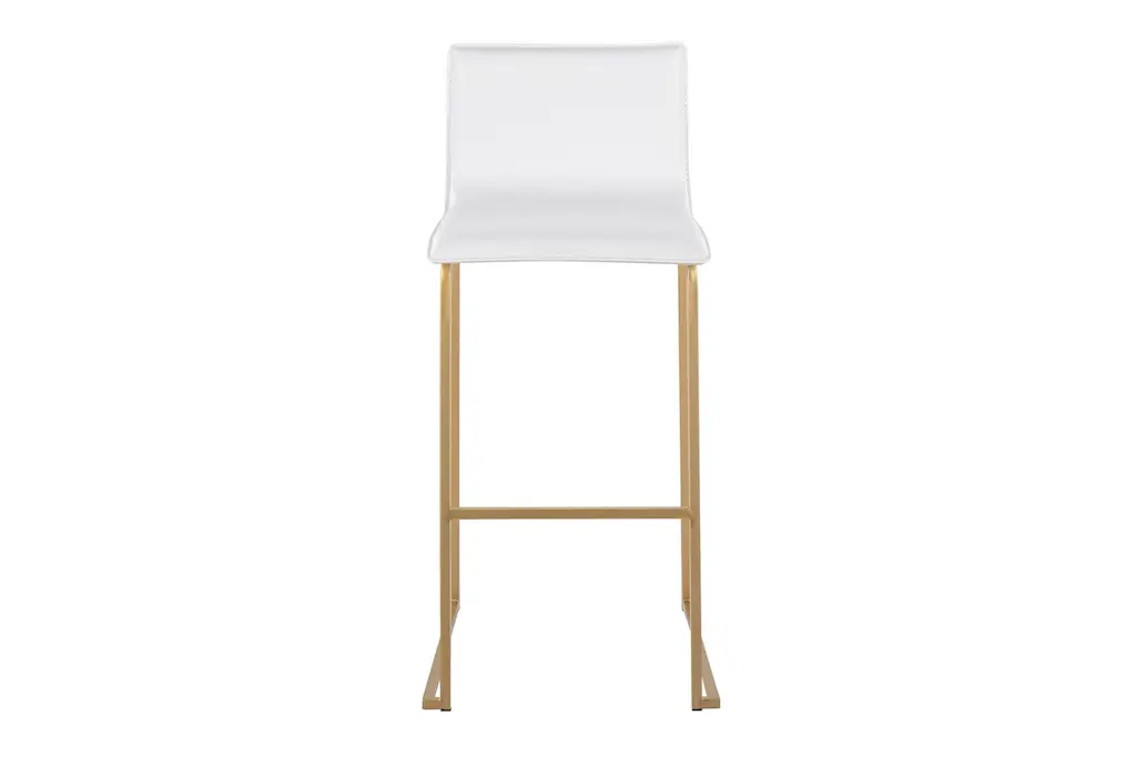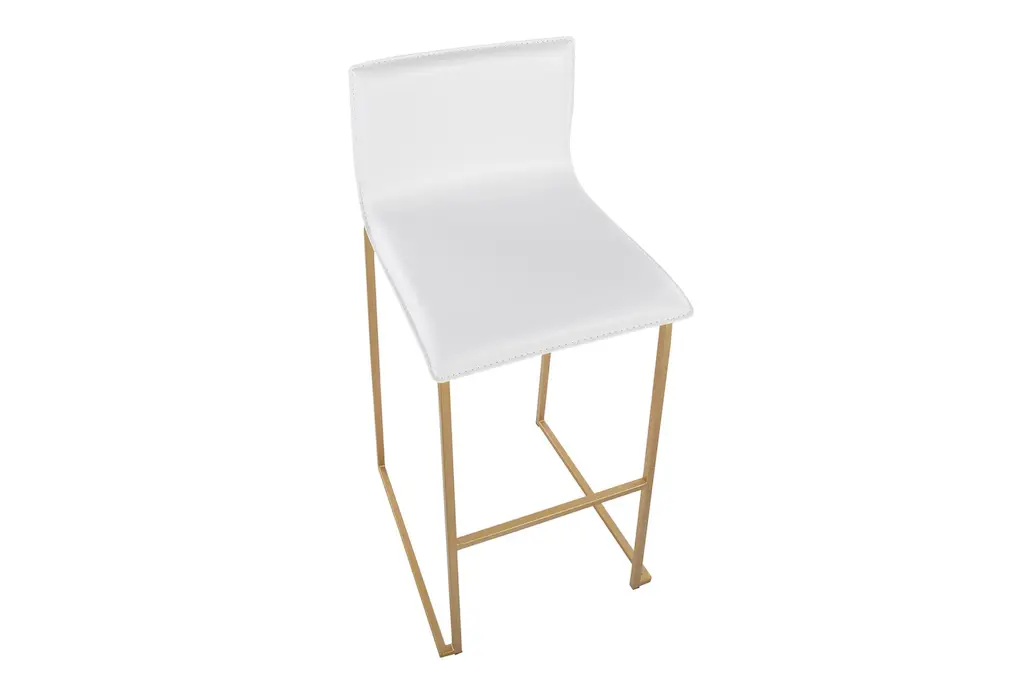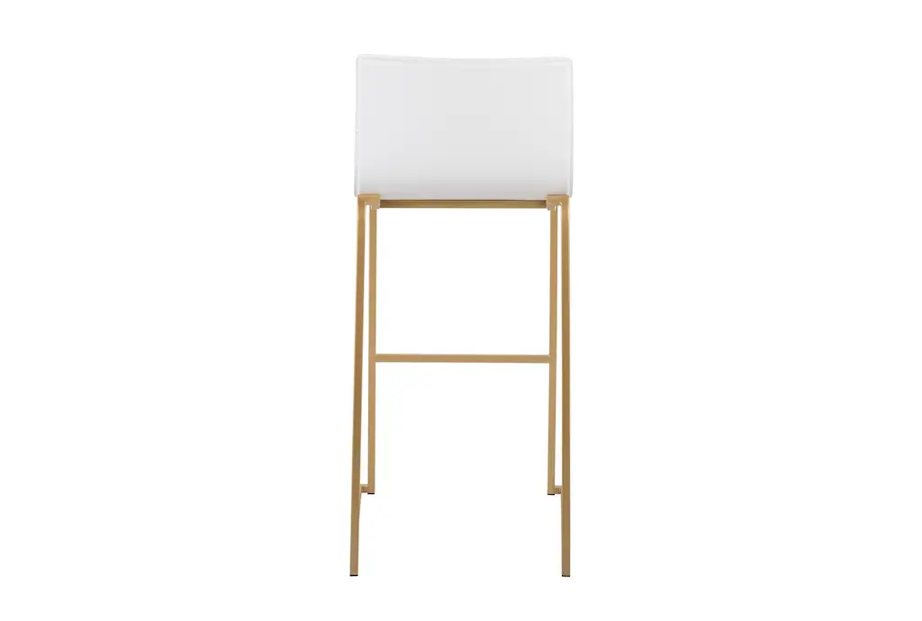 Introducing the Cara Gold Metal Steel + White Faux Leather 29.25" Barstool Set of 2. These modern armless barstools are perfect for your dining room or kitchen, offering a sleek and stylish seating option. The combination of gold steel and white faux leather creates a sophisticated look that complements any contemporary space.