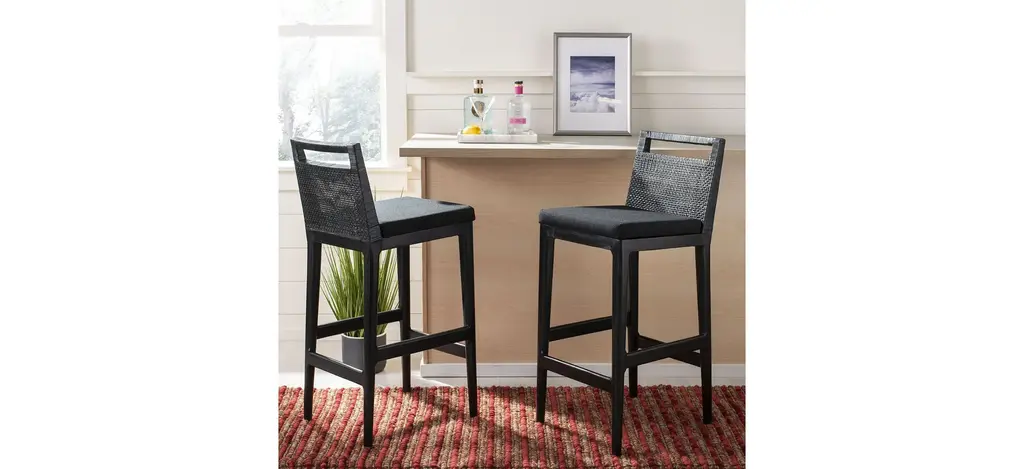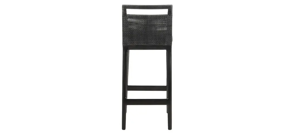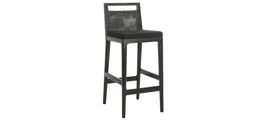 Furnishings at five star resorts in the Maldives inspired this casual Charles Bar Stool. Minimalist geometry and clean lines complement their finely crafted black rattan and mahogany body and easy care black poly acrylic cushions.