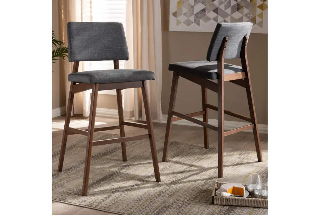 Enhance your dining or kitchen area with the stylish and modern Cole Dark Grey Fabric Upholstered + Wood 30.3" Barstool Set Of 2. These barstools feature a chic grey fabric and sturdy walnut rubberwood frame, making them both comfortable and durable. The armless design and curved back provide a sleek, contemporary look perfect for any space.