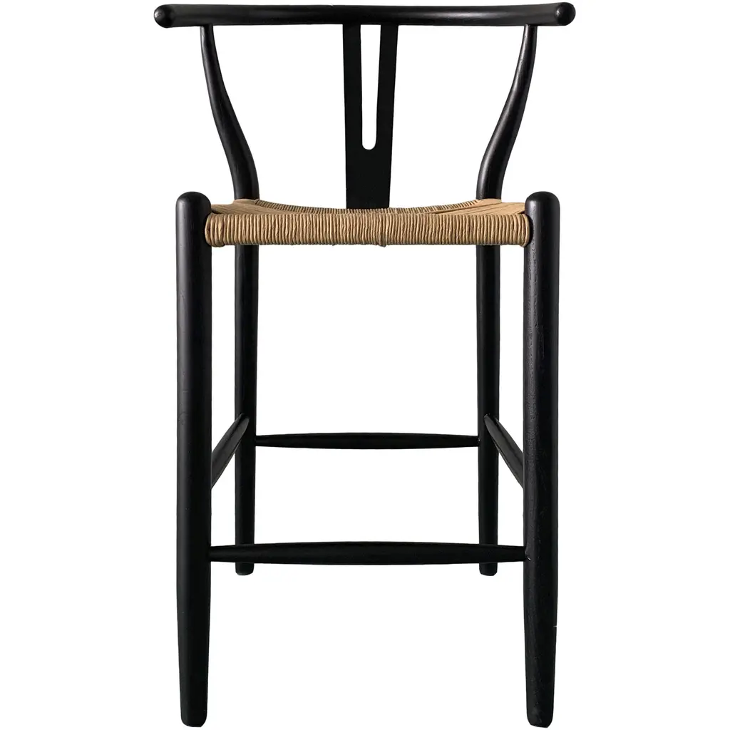 Inspired by traditional Chinese design, this classic stands tall as a modern bar stool. Fashioned with its signature Y-back and semi-circular arms, the stool contrasts a woven synthetic wicker seat with a frame of black-finished teak. The handcrafted stool is skillfully constructed with mortise-and-tenon joinery and corner block seating.