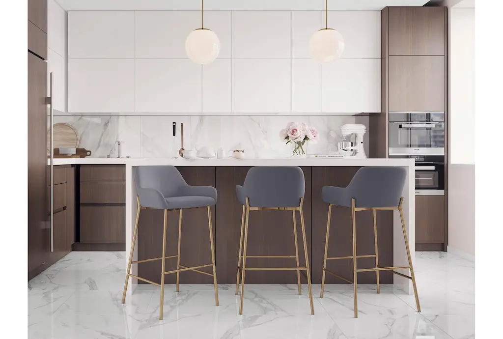 Introducing the Danny Gold + Grey Metal Faux Leather 30" Barstool Set of 2, a perfect addition to your dining room. These modern barstools feature a stylish combination of gold metal and grey faux leather, adding a touch of sophistication to any space. The set includes two barstools, making it ideal for social gatherings or casual dining.