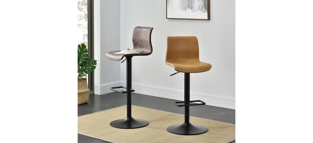 The modern industrial-style Jayden Gaslift Bar Stool: Set of 2 will look right at home pulled up to your kitchen counter or island with its low back. Simply adjust the seat height as needed with the handy pneumatic-lift lever. As comfortable as it is stylish, the Jayden is designed with a gently curved wood seat and steel footrest.