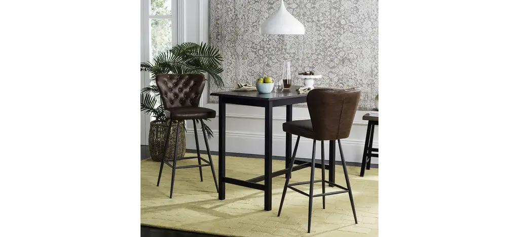 This upscale mid century Kingford bar stool instantly updates any contemporary dining area with vintage curves and sleek metal legs. Designed for the modern jet setter, its leather style upholstery with tufted detail brings character and warmth to the table.