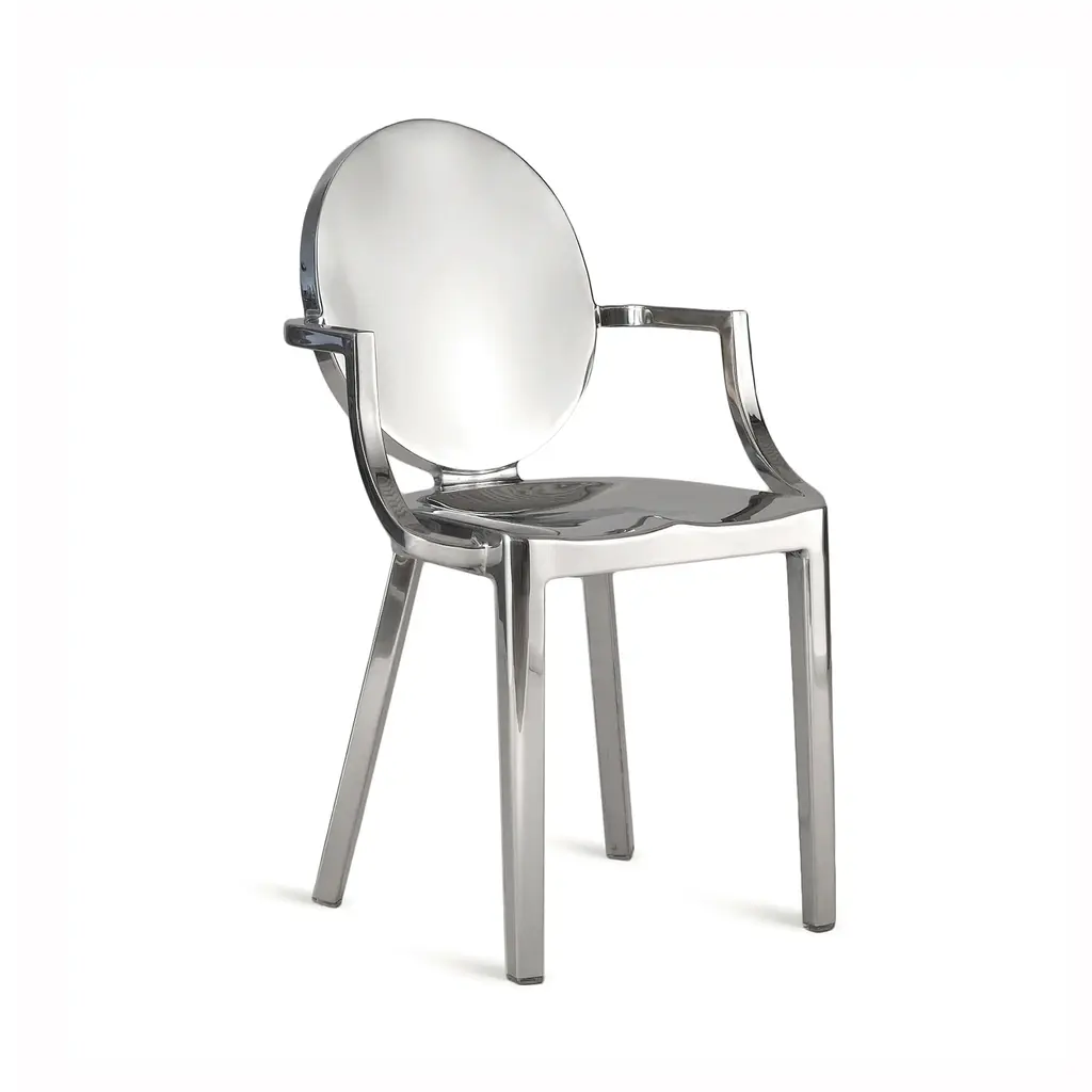 Kong by Philippe Starck, 2003 A timeless piece, built for lifetimes of use, to be kept, cherished and passed on for generations. Made to order. Built by hand from 80% recycled aluminum in Hanover, Pennsylvania by our most skilled craftsmen. Guaranteed for life. First designed for the Chinese restaurant Kong in Paris. The one armed barstool was intended to make it easy and graceful for the guests to slither in and out of the bar. Kong requires the hand welding of 24 separate pieces of aluminum, and 8 hours of hand polishing. Standard glides: soft plastic TPU glides for all-around use, including outdoor use. Alternative glides available at an upcharge.
