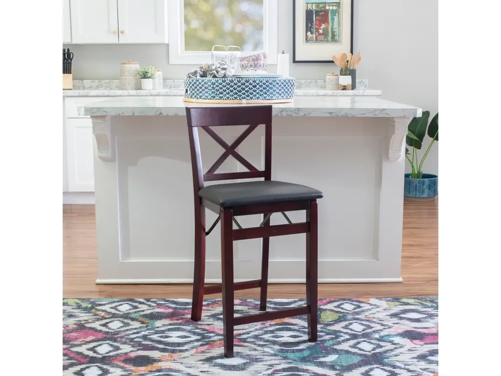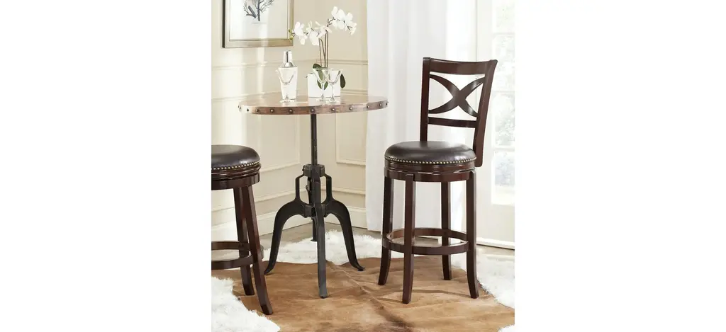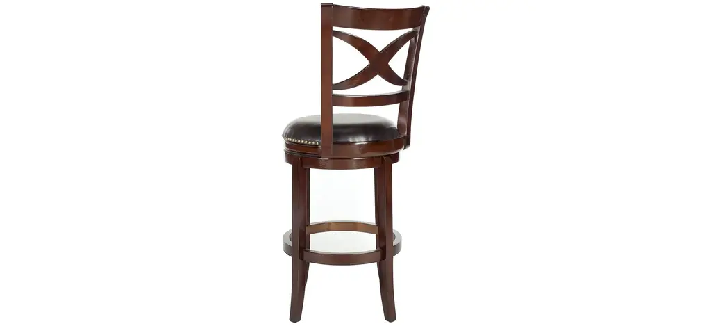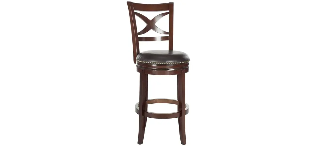 A lavishly carved X style back lets the Kyre Swivel Bar Stool provide an open, airy vista from the kitchen or living room. Upholstered in brown PU leather with bronze nail head trim, it is crafted of eco friendly hardwood in a sierra brown finish.