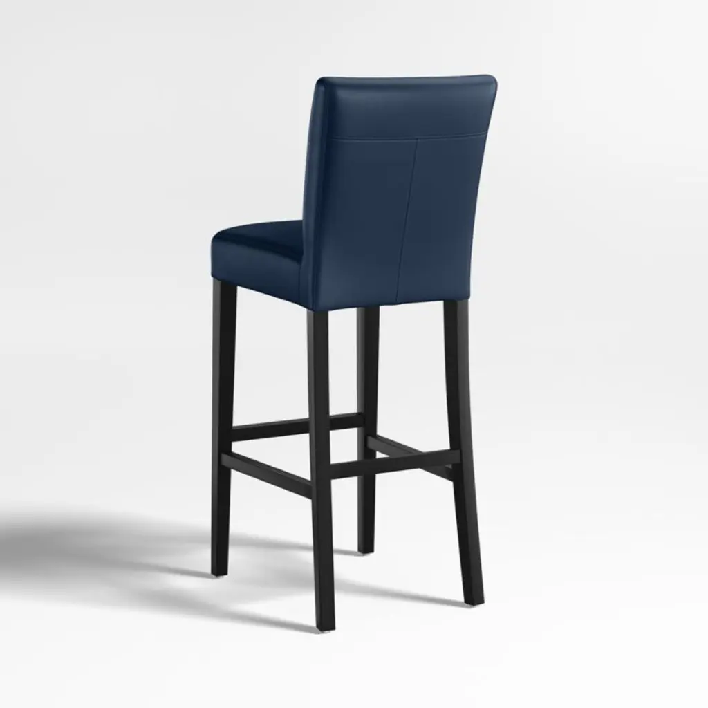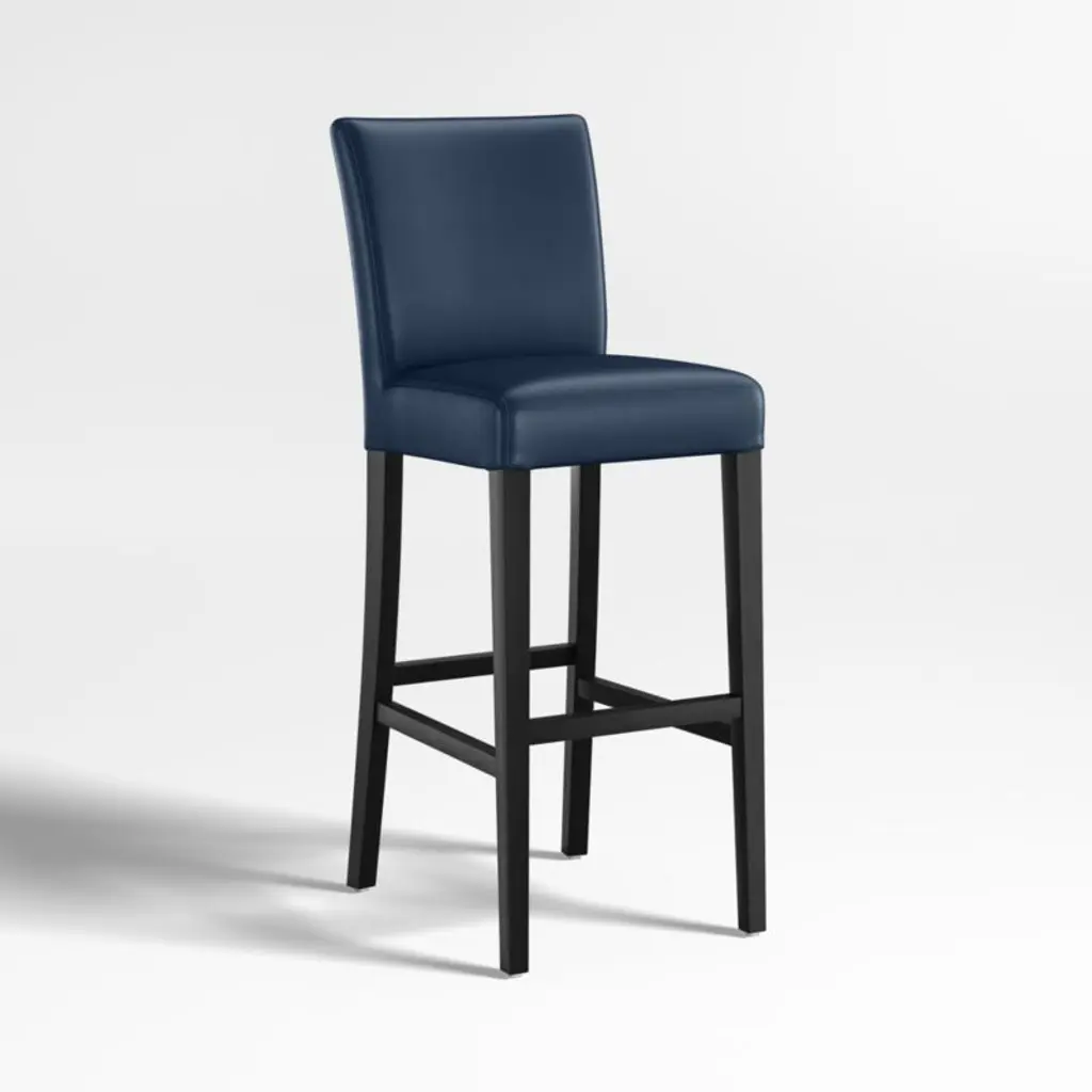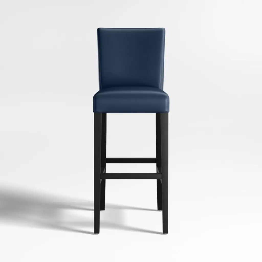 Stylish and contemporary Lowe wraps the classic Parsons-style chair in pure color, with pebbled, bicast leather in deep, elegant navy blue. With a roomy cushioned seat and back, it's just right for bars.