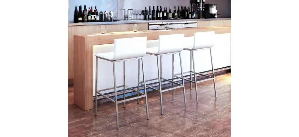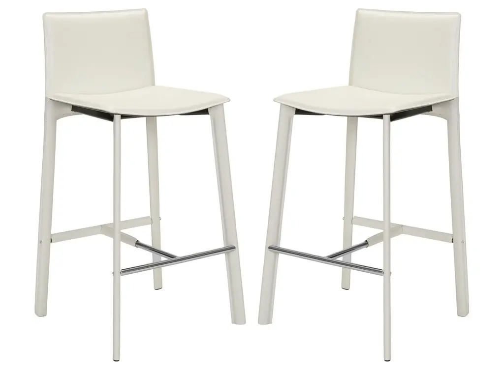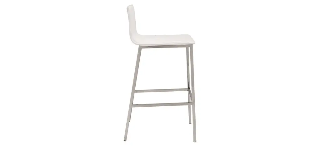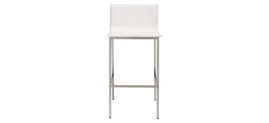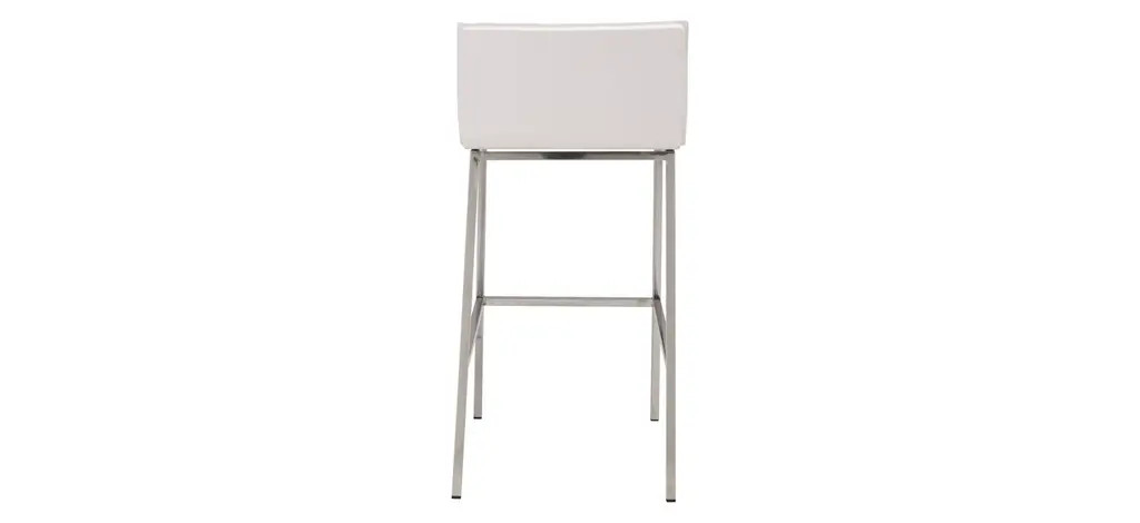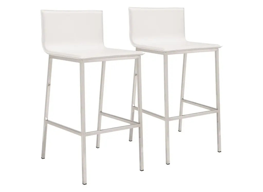 The Marina Bar Stool: set of 2 has elegant seamed stitching and low profile seat with its subtlety-curved will make a statement of style. Seat is upholstered in white faux leather and is supported by a slim, but sturdy stainless steel frame with a built-in footrest.