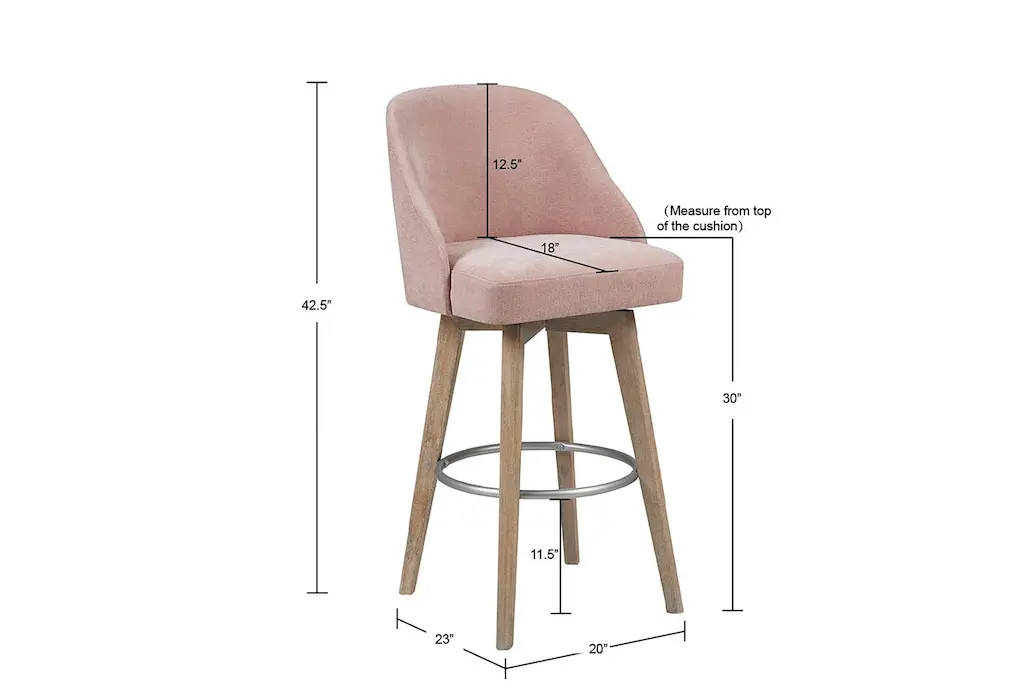 The Marshall Pink Bar Stool with Back and Swivel Seat is a modern style stool made of solid wood and plywood with a reclaimed gray smooth finish, featuring a curved shape and foam cushions for comfort, and a matte silver swivel for convenience. Assembly is required.