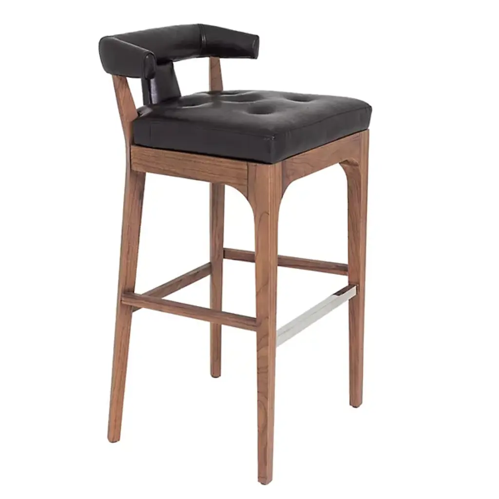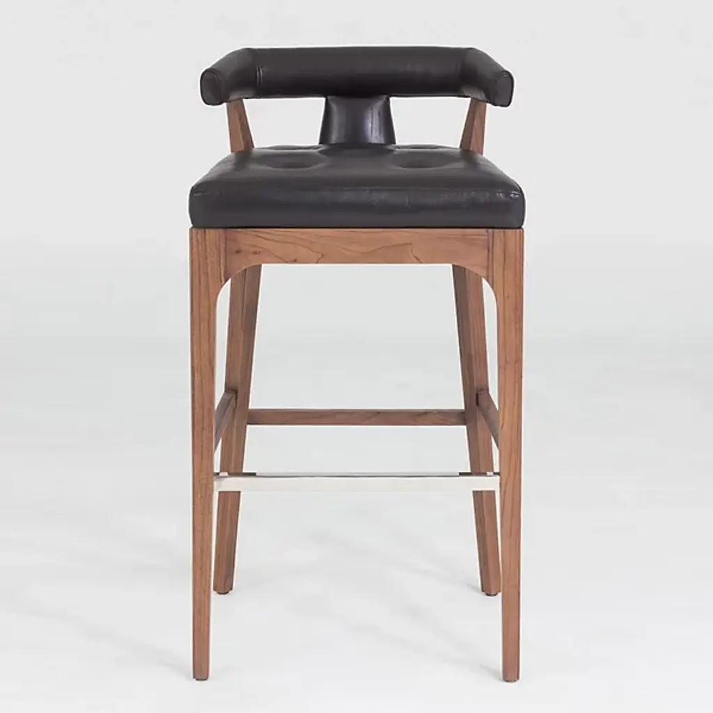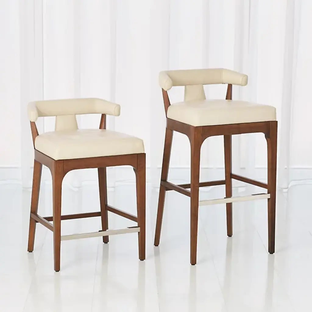 Bring tasteful seating support and an inspired modern accent to elevated indoor spaces with the Moderno Bar and Counter Stool from Global Views. A series of four slender walnut legs braced by a stainless-steel leg bar for added durability elevate a plush seat accompanied by angular braces and a small, wraparound back. The wood and leather contrast well, providing an airy retro-modern style with a touch of welcome solidity, and the natural grain of the walnut wood is on full display.