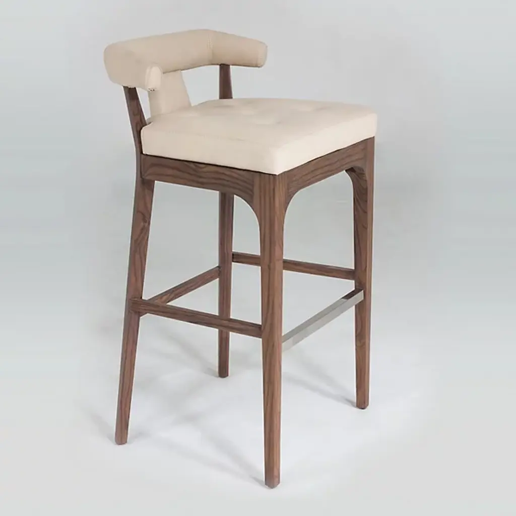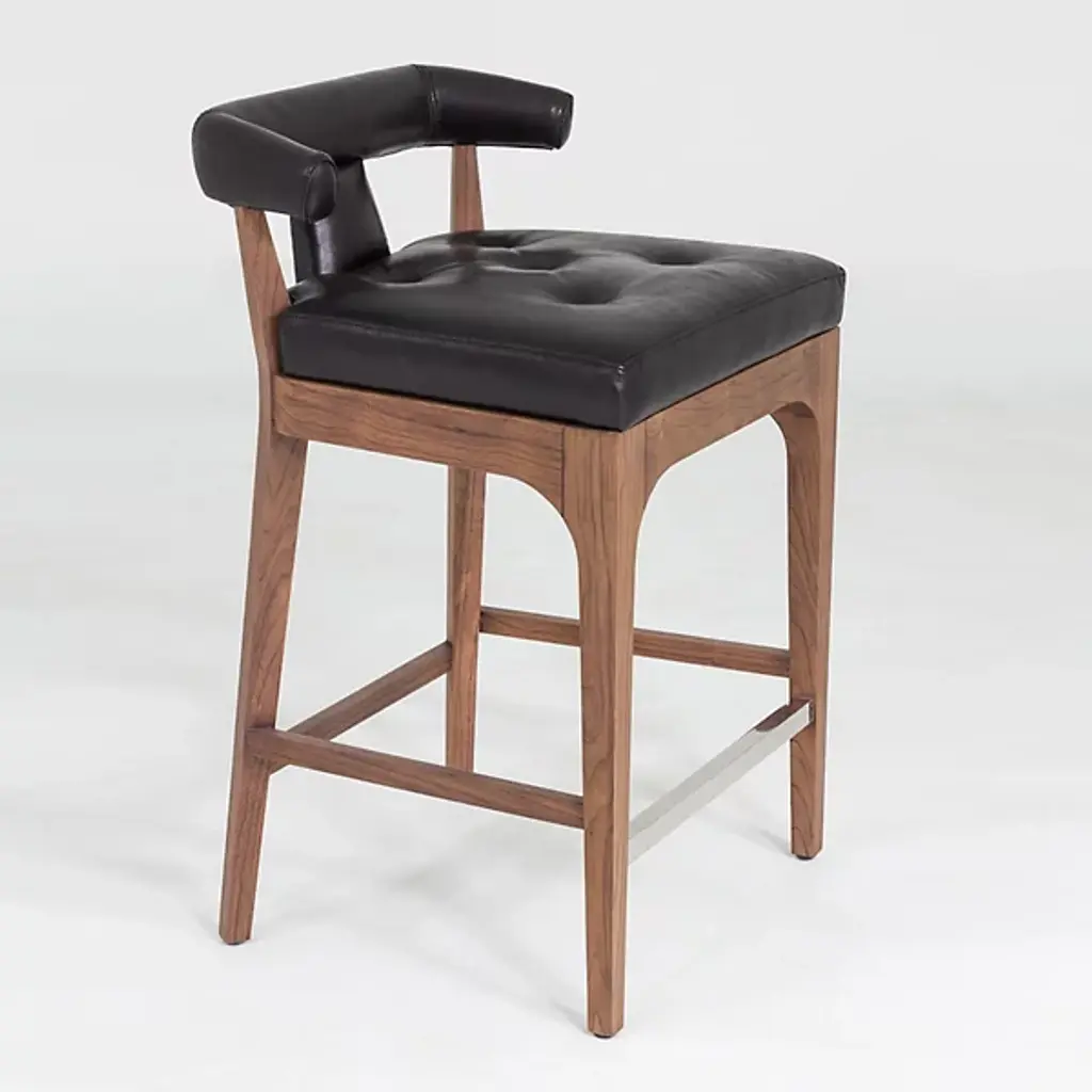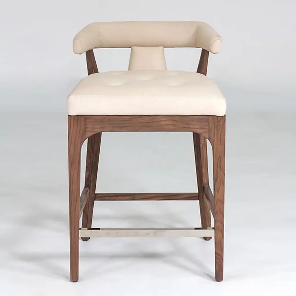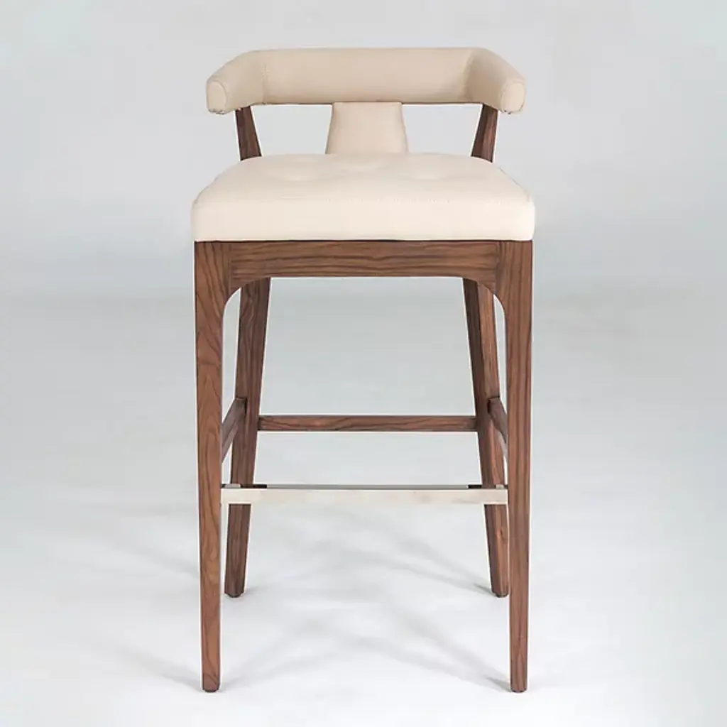 Bring tasteful seating support and an inspired modern accent to elevated indoor spaces with the Moderno Bar and Counter Stool from Global Views. A series of four slender walnut legs braced by a stainless-steel leg bar for added durability elevate a plush seat accompanied by angular braces and a small, wraparound back. The wood and leather contrast well, providing an airy retro-modern style with a touch of welcome solidity, and the natural grain of the walnut wood is on full display.
