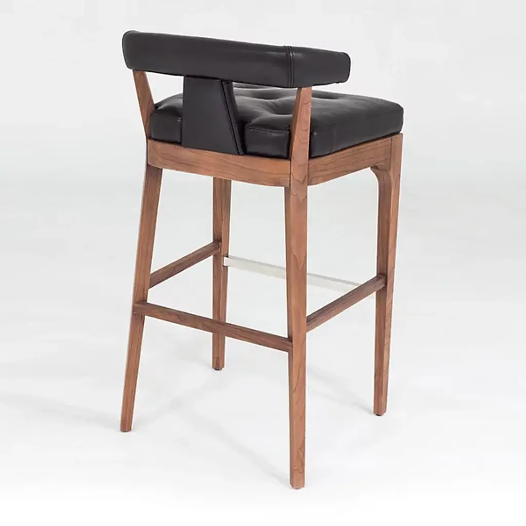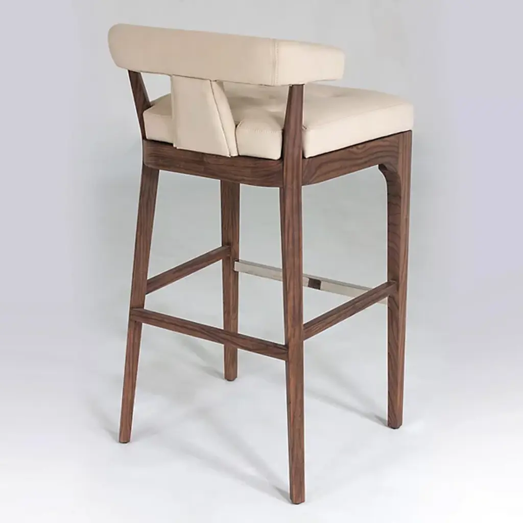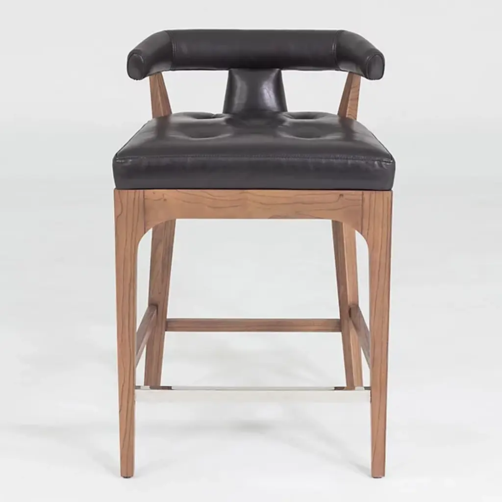 Bring tasteful seating support and an inspired modern accent to elevated indoor spaces with the Moderno Bar and Counter Stool from Global Views. A series of four slender walnut legs braced by a stainless-steel leg bar for added durability elevate a plush seat accompanied by angular braces and a small, wraparound back. The wood and leather contrast well, providing an airy retro-modern style with a touch of welcome solidity, and the natural grain of the walnut wood is on full display.