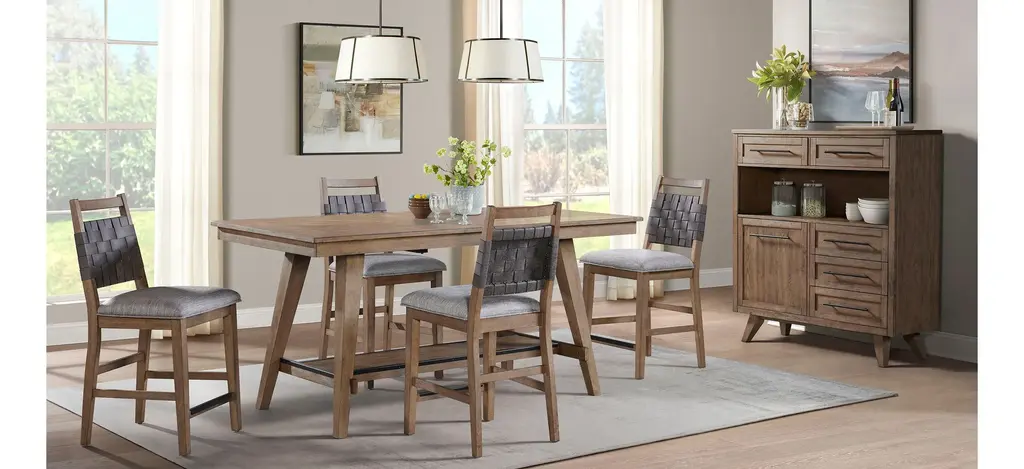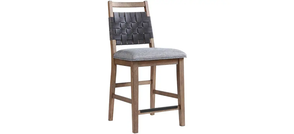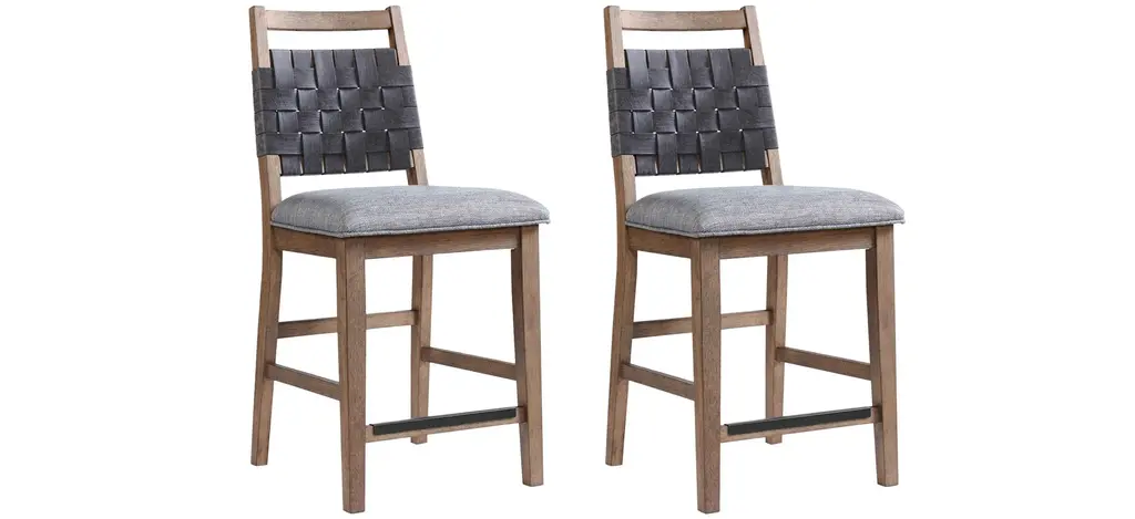 The Oslo Bar Chair (set of 2) is constructed with wire brushed oak veneer and offered in a weathered finish. This chair features an upholstered seat for added comfort and a unique woven seat back.