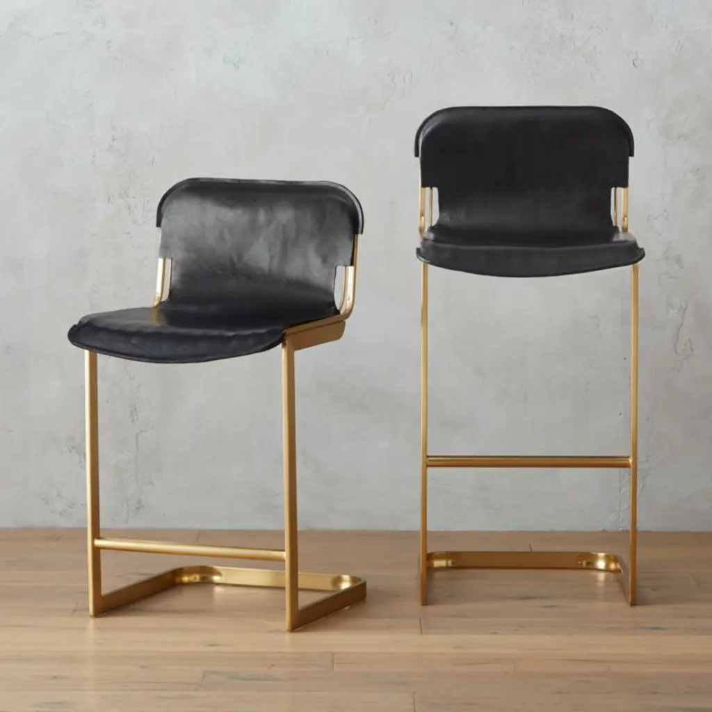 The Rake Brass Barstool was designed exclusively for CB2 in collaboration with Kravitz Design by Lenny Kravitz. A fashion-forward pairing of supple leather and slick metal. Gleaming brass-plated brushed steel frame is outfitted in a genuine black leather sling that slips on and off to create two distinct looks. Finished with a raw edge for a handmade and crafted appeal, natural hide will wear beautifully and become even more conditioned over time. Chair's architectural design is thoughtfully engineered to look striking from every angle with a continuous, cantilevered base that adds a little bounce to the sit.