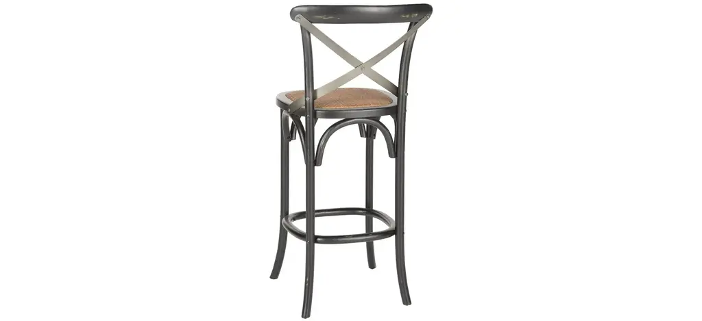 Extend the classic Thonet look from the dining table to the kitchen island or bar with the Remi X back bar stool. No chair is as famous as Thonet's bentwood caf_ model, and Safavieh's bar stool captures the look in a distressed hickory finish with graceful frame, rattan seat and authentic cross back arch brace in black metal.