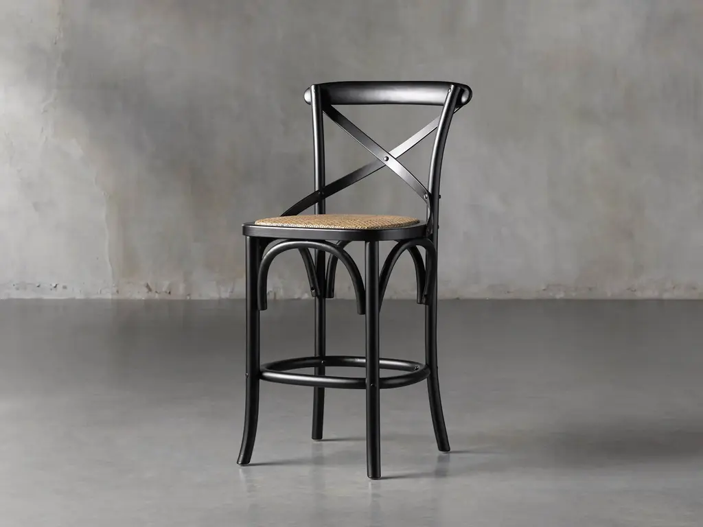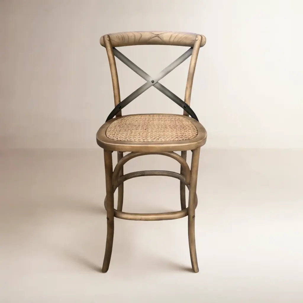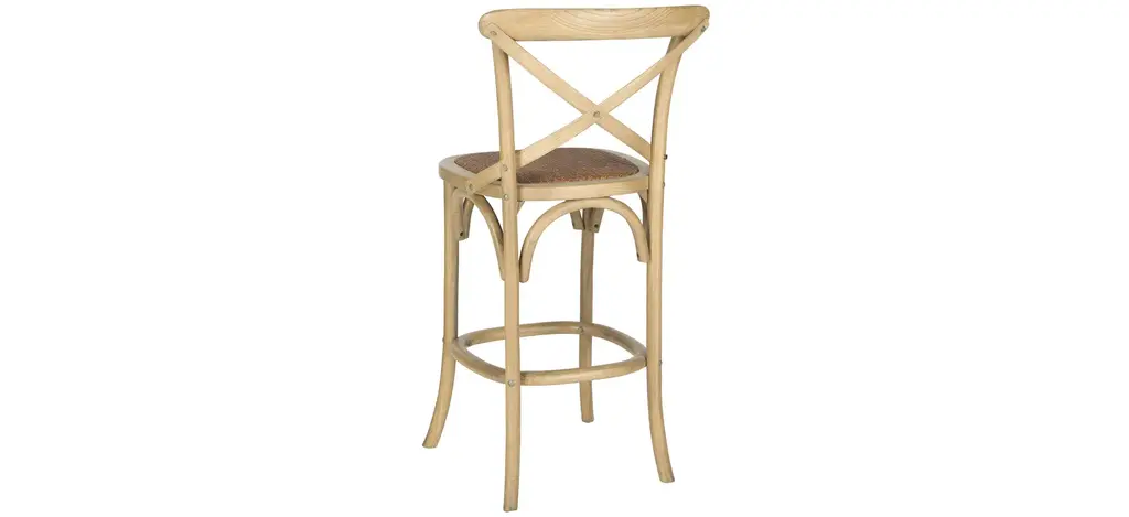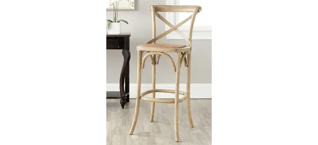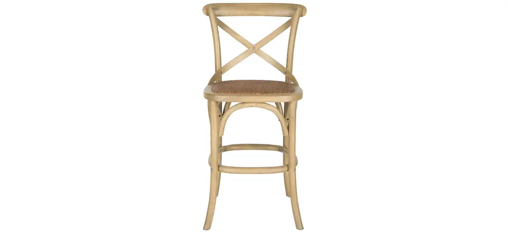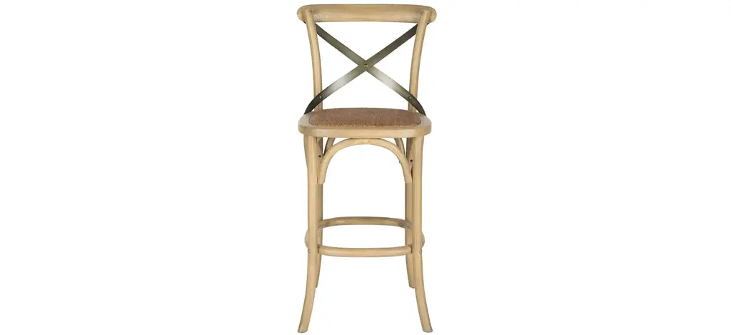 With its willowy frame and iconic cross back inspired by Michael Thonet's classic bistro chair, the Roxy bar stool by Safavieh is ideal in kitchen or great room. Crafted of solid American oak, including the X arch brace, this casual bar stool is finished in weathered oak with a seat of rattan caning.