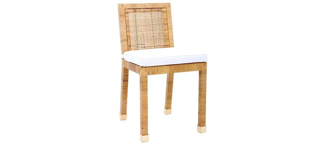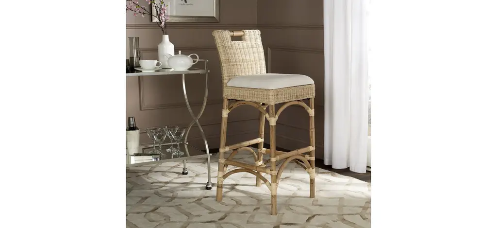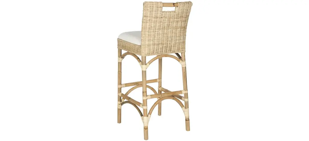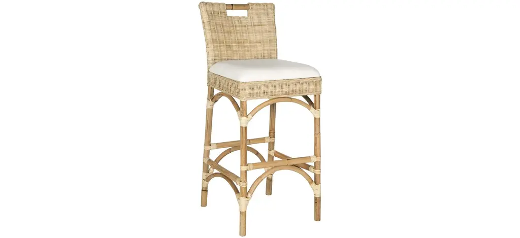 A transitional twist on Thonet styling, the natural rattan Samaria Bar Stool marries a contemporary seat back and a base with the bentwood curves of European bistro chairs. A comfy white poly cotton cushion invites lingering conversation in the kitchen.