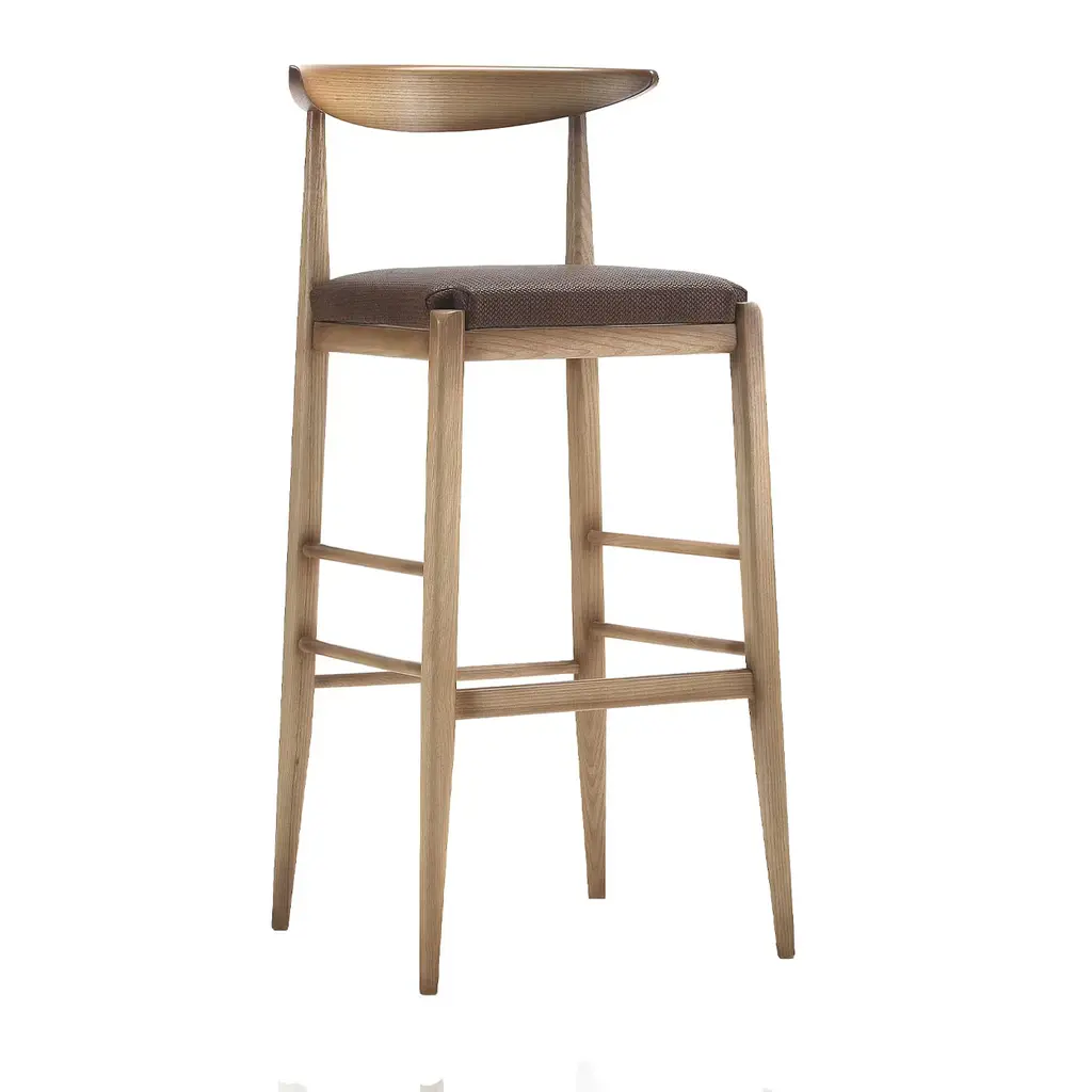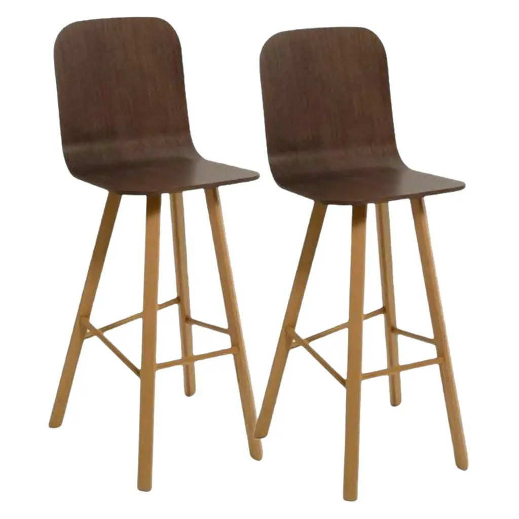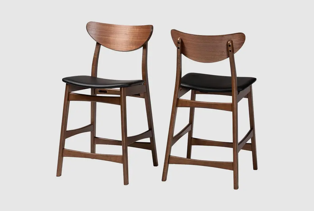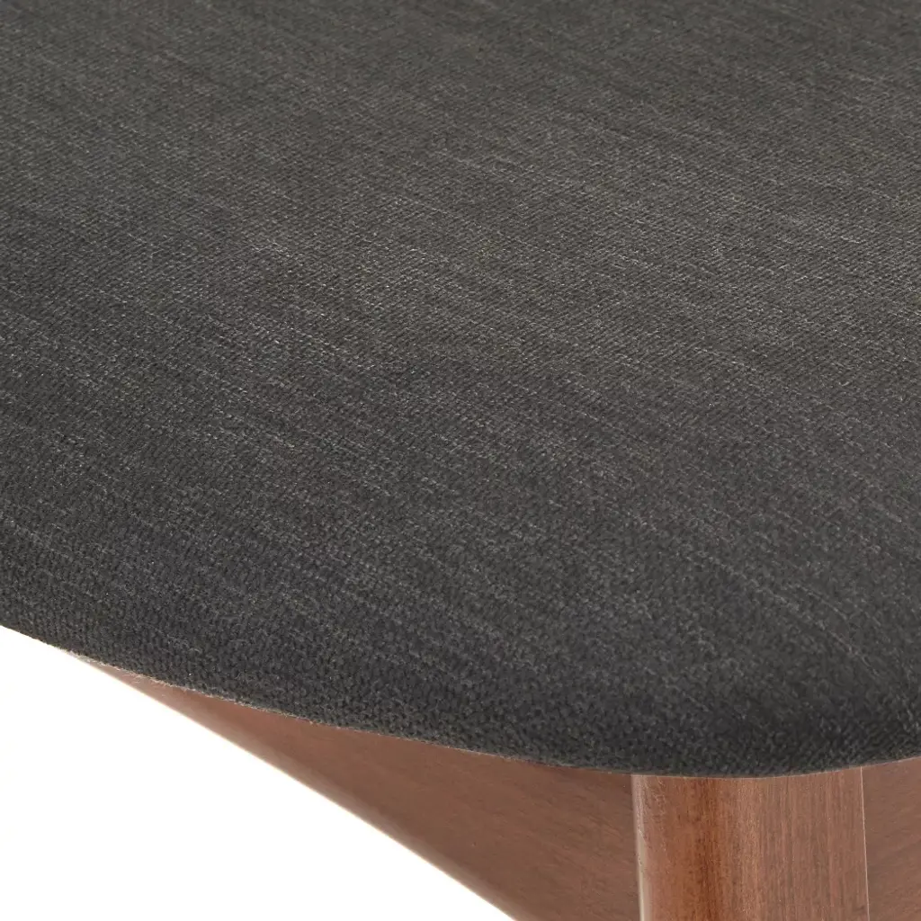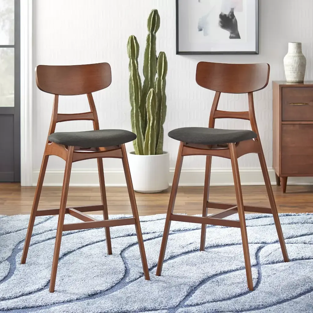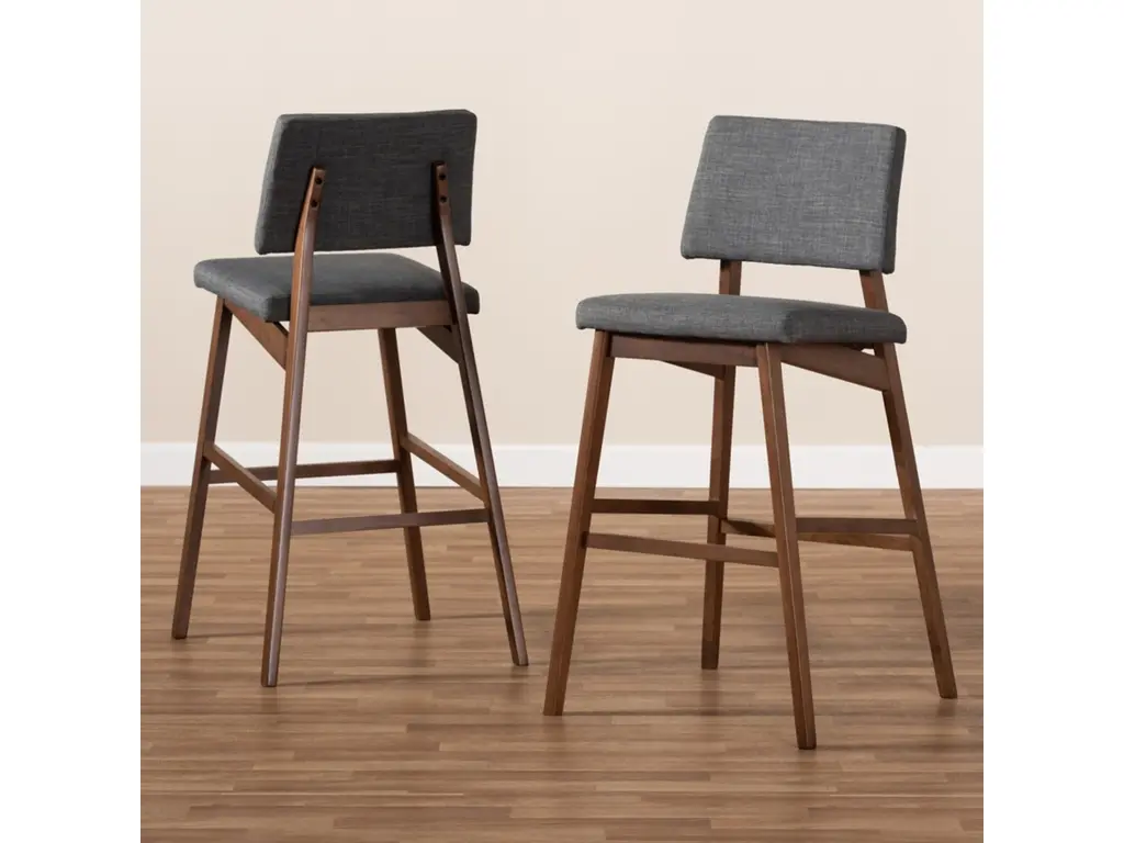 The Ron Stool by Lifestorey makes a sharp addition to any Mid-century modern space. A set of (2) modern style stools with angled legs and a curved backrest enhances any counter-height table or kitchen island. These stools feature an upholstered soft gray linen like fabric with supportive cushioning for added comfort. These stools are constructed in solid beech wood in a warm walnut finish with a 30" seat height.