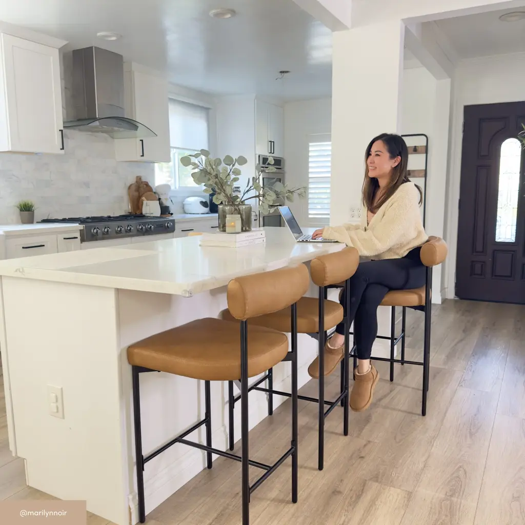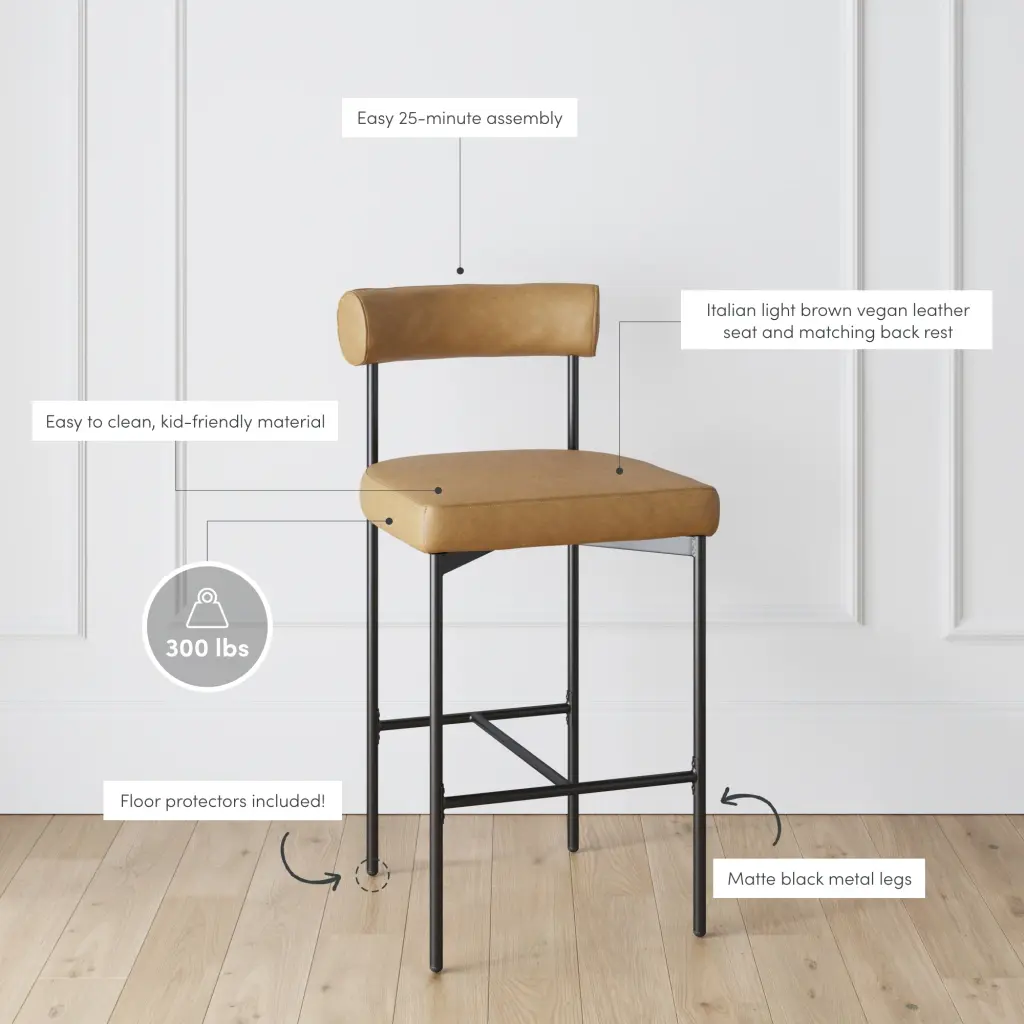 Meet Dahlia. We paired comfortable cushioned seats with cushioned backs covered in low maintenance vegan leather for the ultimate bar stool experience. This set of 4 wire frame stools were inspired by mid-century design and will provide an effortless touch to your kitchen or dining area. They have a slim profile to keep your space light and airy, while the matte black frames draw the eye to their durable footrests and made-to-last legs.