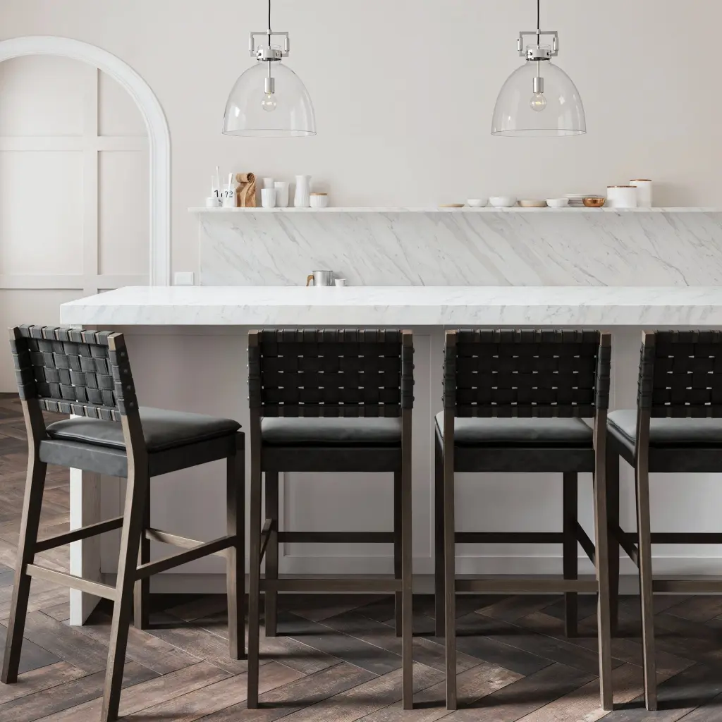 Grab your favorite drink and sit comfortably for hours on the Cohen bar stool. Cohen's solid wood frame has a hard wearing painted finish and is complemented by a brushed black leather back that adds sophistication to your kitchen, even when tucked and hidden under the counter. We even added a comfortable padded saddle seat with rounded corners and perfectly placed foot rests. If you take a closer look you'll see studs on the side of the chair—a detail too luxurious to miss! With an easy 25 minute assembly time, you won't regret grabbing more than one!