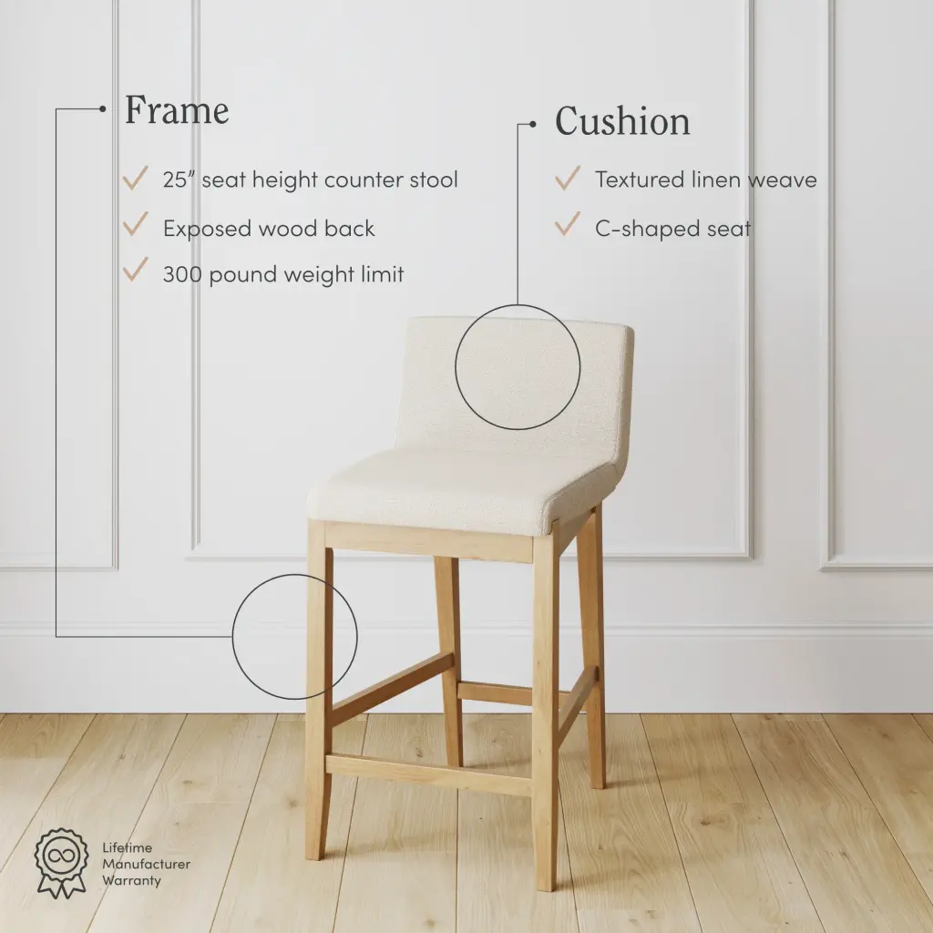 Kick your feet up in style with our Gracie bar stool. With an exposed wood back and sleek modern design, Gracie is sure to stun. Gracie combines a natural brown wood finish and a natural textured linen weaved cushion for ultimate comfort and style. It boasts a modern silhouette with tapered legs and a curved seat, making this bar stool the star of any kitchen. So grab your drink of choice and sit back in full comfort on these made-to-last bar stools.