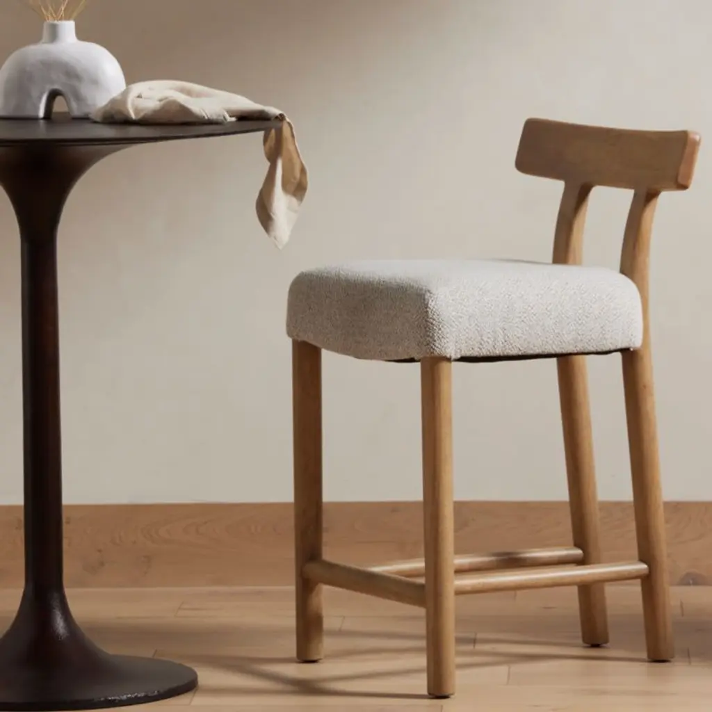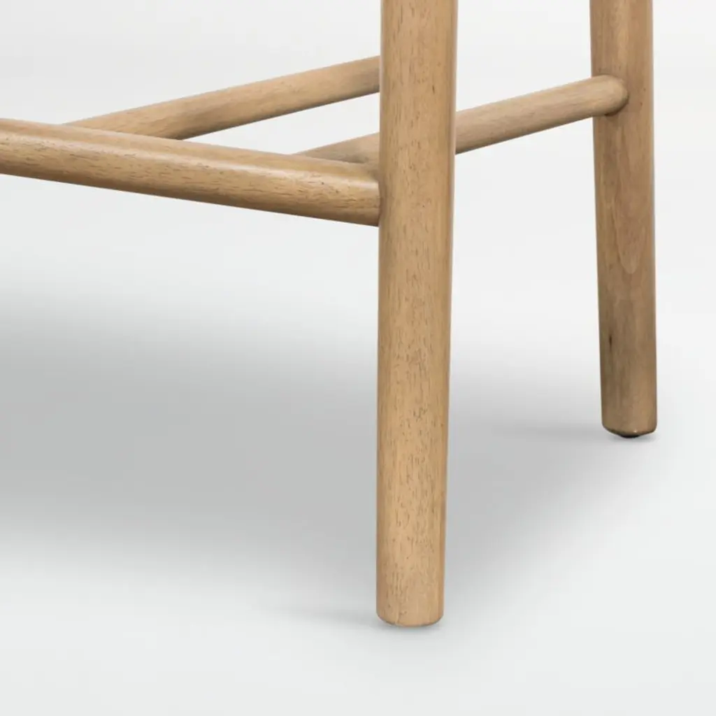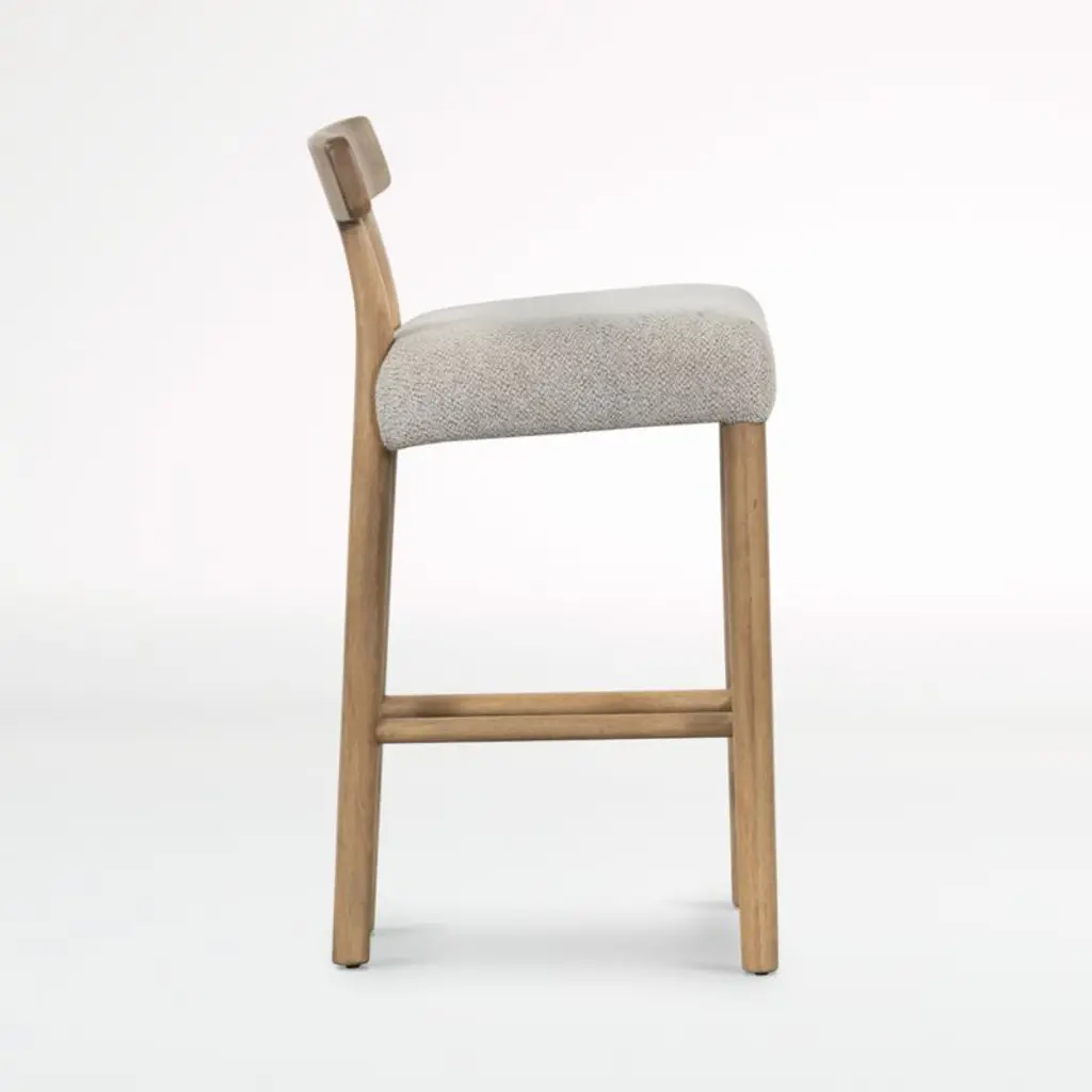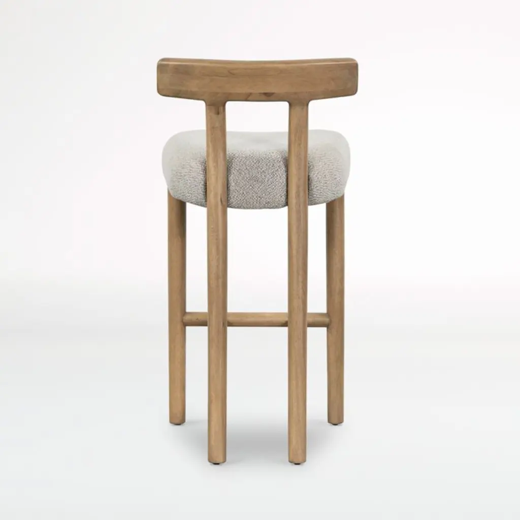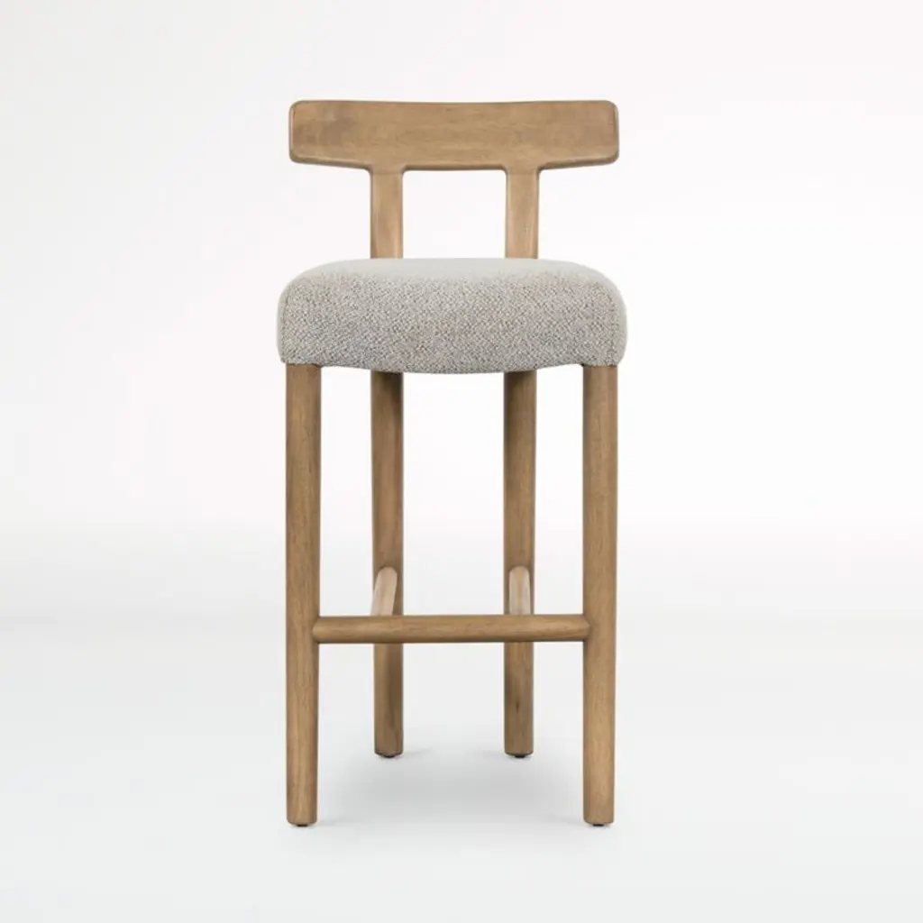 Deceptively simple, our Ziady bar stool strikes the perfect balance between form and material. The solid hardwood stool staggers its stance with wide-set legs at the front and more narrowly spaced rear legs that rise up seamlessly to a T-shaped backrest. The perfectly proportioned seat adds comfort, upholstered in a pebbled fabric that perfectly complements the stool's burnished finish.