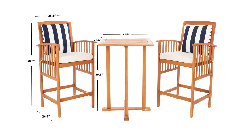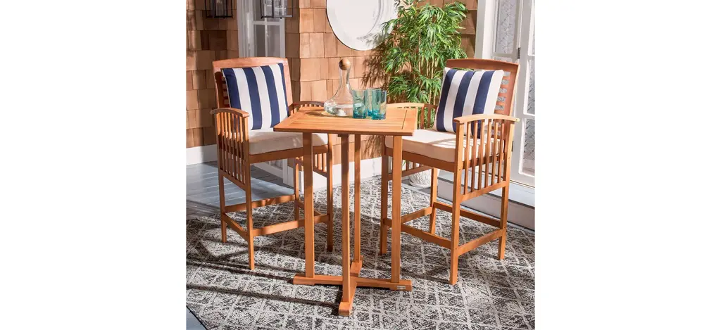 The hottest rooftop bars in Palm Springs inspired this Garretson 3-pc. Outdoor Pub Table Set. Crafted in a warm natural finish, its contemporary bar height table and sleek matching chairs with neutral upholstery and bolster pillows lend instant style to any outdoor terrace or entertaining area.