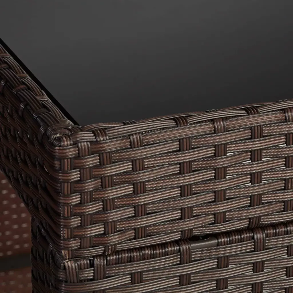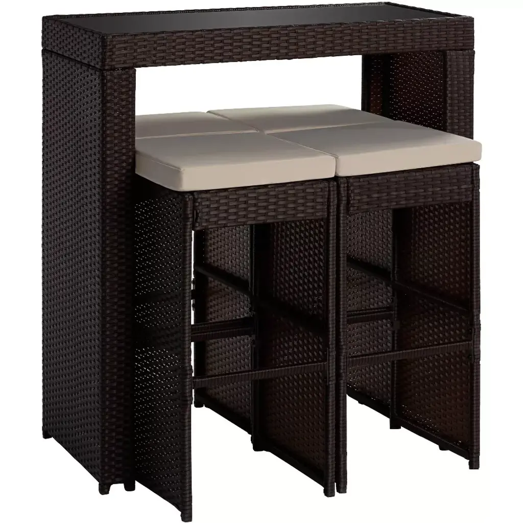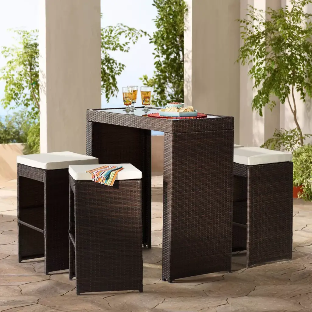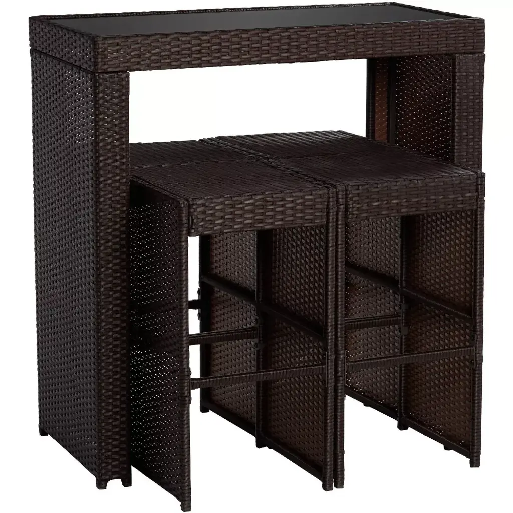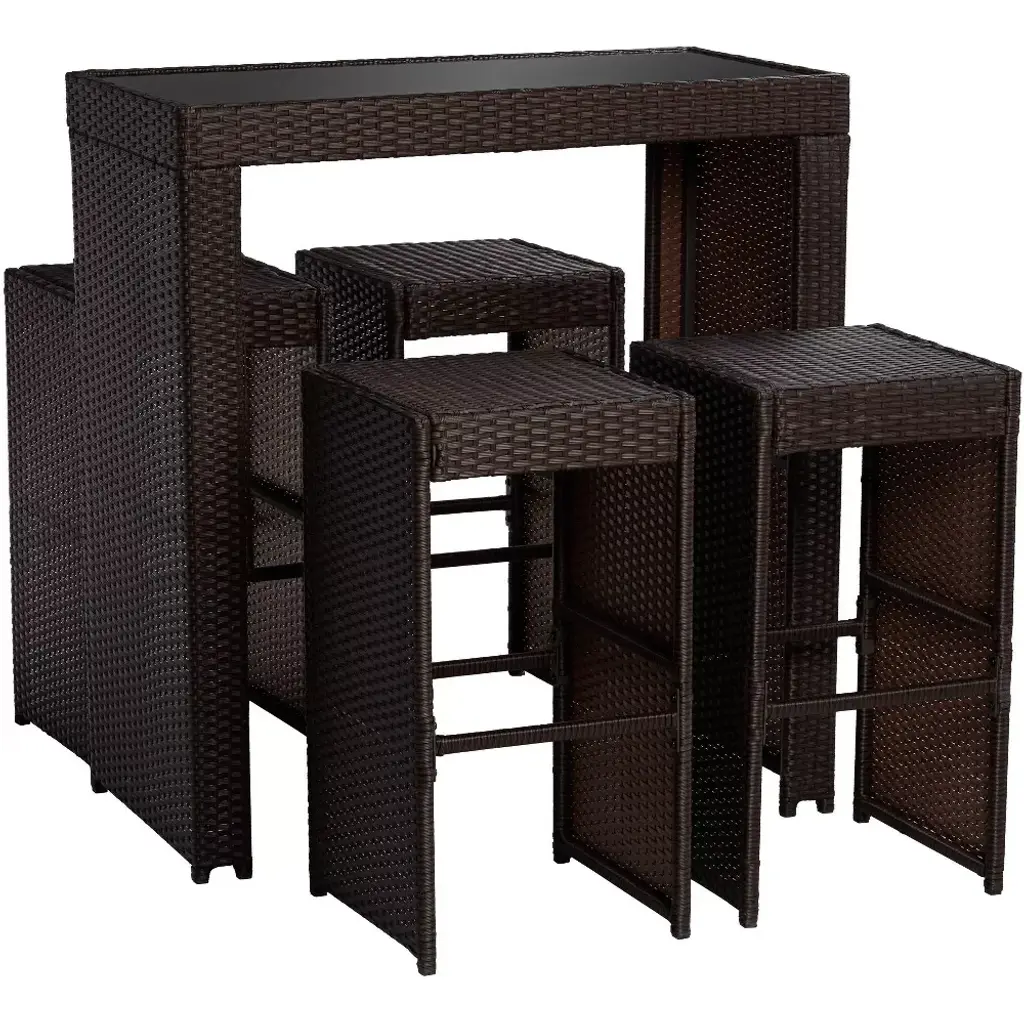 Have an outdoor snack or drink in a relaxed, casual atmosphere with this wicker outdoor bar table and chair set. It comes with four chairs and one table, all wrapped in a handsome dark brown rattan. Glass top as pictured included.
