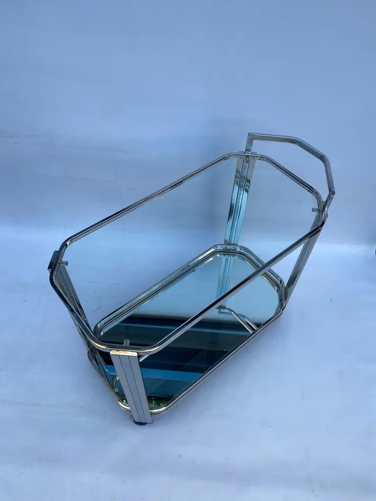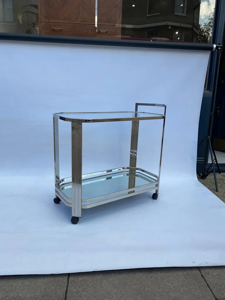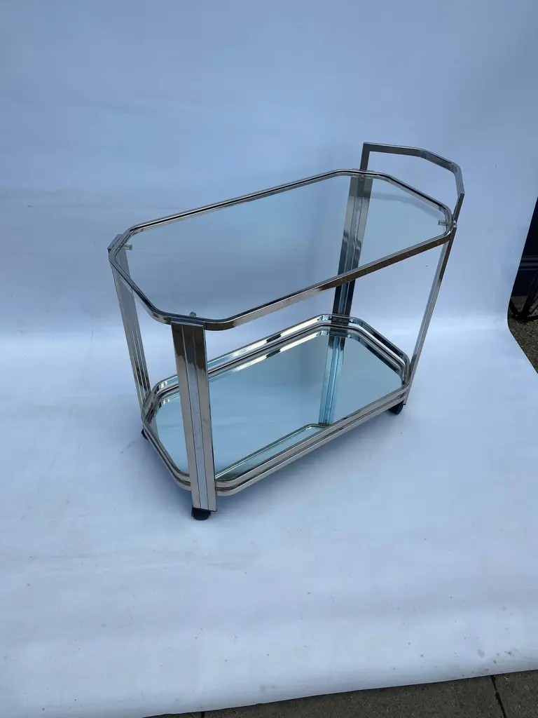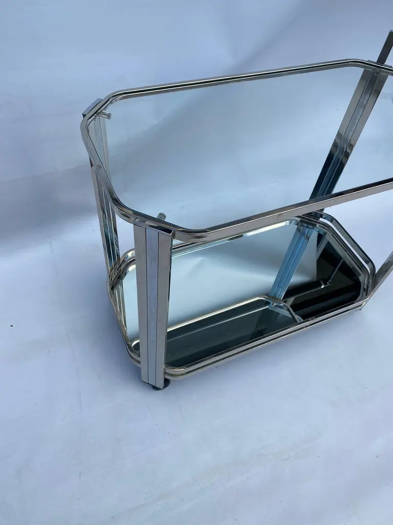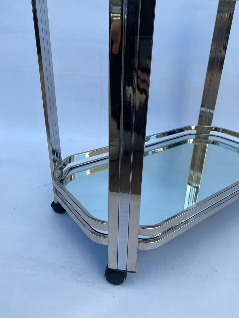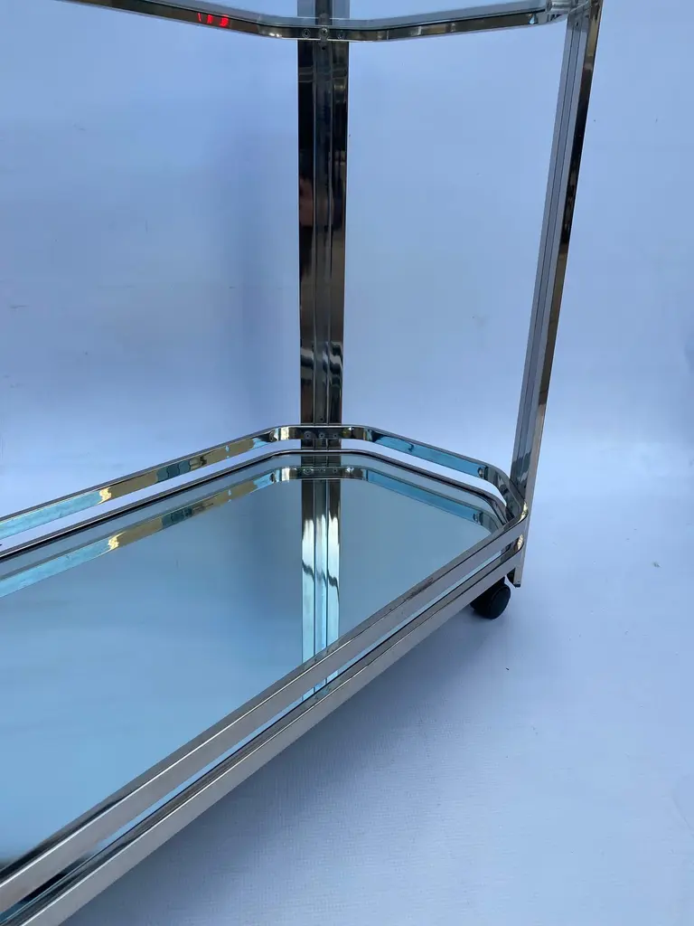 A stylish vintage 1970s octagonal rectangular bar cart which usually it gets attributed to Romeo Rega.There's a two tone chrome frame which supports the two tiered framed glass and mirror panels for the bottles and bar accessories. The metal frames have soft edges making it smoother on the eye.The frame have some light wear but other than that the glass top and the mirror and glass are in good condition.Practical and elegant piece that you can use either in a commercial space or in your living room to entertain yourselves and your guests! This item dismantles into flat pack to be post internationally. Please contact us for international postage quotes.CREATOR: Romeo Rega PLACE OF ORIGIN: ItalyDATE OF MANUFACTURE: 1970sPERIOD: 1970 - 1979MATERIALS & TECHNIQUES: Chrome, glass, mirrorCONDITION: Good original condition.WEAR: Wear consistent with age and use. Some patina and light wear on the frameHEIGHT: 74cm 29inWIDTH: 85cm 33.5inDEPTH: 40cm 16in