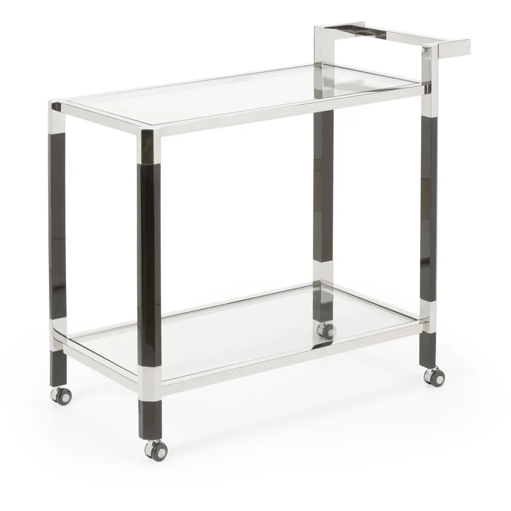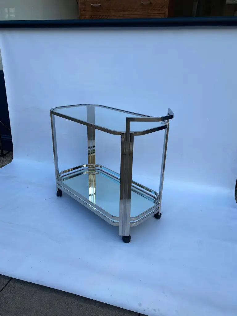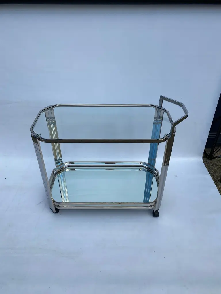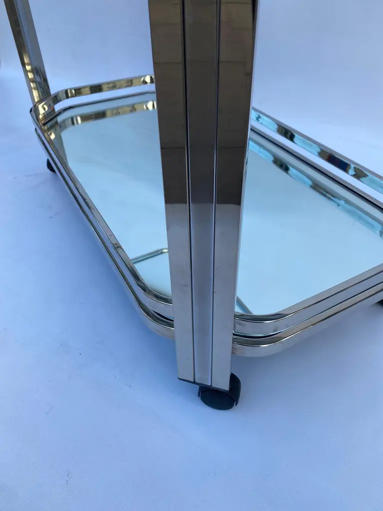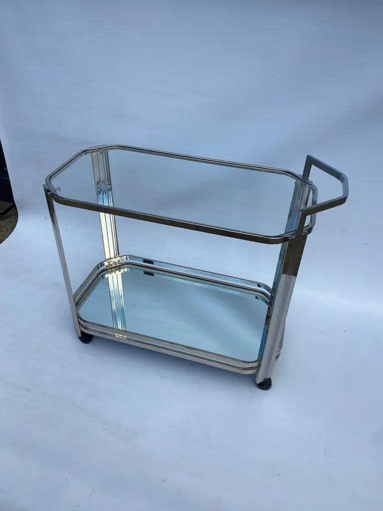 A stylish vintage 1970s octagonal rectangular bar cart which usually it gets attributed to Romeo Rega.There's a two tone chrome frame which supports the two tiered framed glass and mirror panels for the bottles and bar accessories. The metal frames have soft edges making it smoother on the eye.The frame have some light wear but other than that the glass top and the mirror and glass are in good condition.Practical and elegant piece that you can use either in a commercial space or in your living room to entertain yourselves and your guests! This item dismantles into flat pack to be post internationally. Please contact us for international postage quotes.CREATOR: Romeo Rega PLACE OF ORIGIN: ItalyDATE OF MANUFACTURE: 1970sPERIOD: 1970 - 1979MATERIALS & TECHNIQUES: Chrome, glass, mirrorCONDITION: Good original condition.WEAR: Wear consistent with age and use. Some patina and light wear on the frameHEIGHT: 74cm 29inWIDTH: 85cm 33.5inDEPTH: 40cm 16in