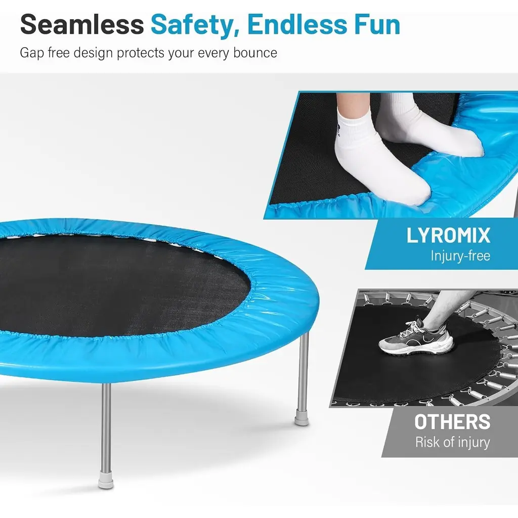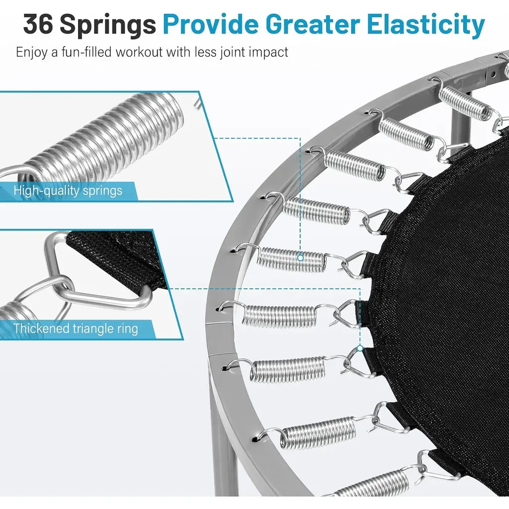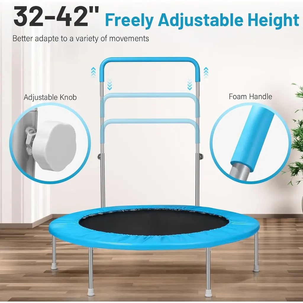 The bouncing motion of the trampoline is a very convenient way of exercise, and you can jump a few times anytime, anywhere, indoors or outdoors.For adults:you can shed pounds of fat,improve the body,strengthen the immune system,promote blood circulation,enhance lung vitality and muscle at anytime,is your ideal choice for weight loss,shaping and aerobic exercise.For kids:strengthen the immune system,improve the body,increase the body's balance ability 【Safe & Stable Support】40/48 inch small rebounder features reinforced steel frame, 36 high-tension springs, and waterproof, wear-resistant PP mat to ensure stable support and can hold up to 220 lbs, providing you a safe and enjoyable bouncing experience.【32-42" Freely Adjustable Bar】This fitness trampoline can be adjusted to different heights according to various exercise needs, offering high adaptability and is suitable for adults and children over 6 years old. The foam padding on the handle enhances comfort and safety, ensuring a firm grip even during sweaty workouts.【Gap-Free Design】Covers all gaps between springs, the 40/48" trampoline with thick safety pad can protect your feet as you jump and elevate your safety. With this thoughtful design, our small exercise trampoline offers safe, pleasurable bouncing, letting you leap with confidence.【Efficient Indoor Exercise】10 minutes of bouncing equals 30 minutes of yoga, 40 minutes of swimming or 60 minutes of jogging.If you want to work out efficiently, this mini workout trampoline for adults and kids is a great choice for combining exercise with fun to stay healthy and energized.【Versatile Use】The rebounder trampoline for adults is versatile for both indoor and outdoor use. Whether in the garden or the living room, you can always use this mini rebounder trampoline for yoga, stretching, aerobics or basic jumping exercises.