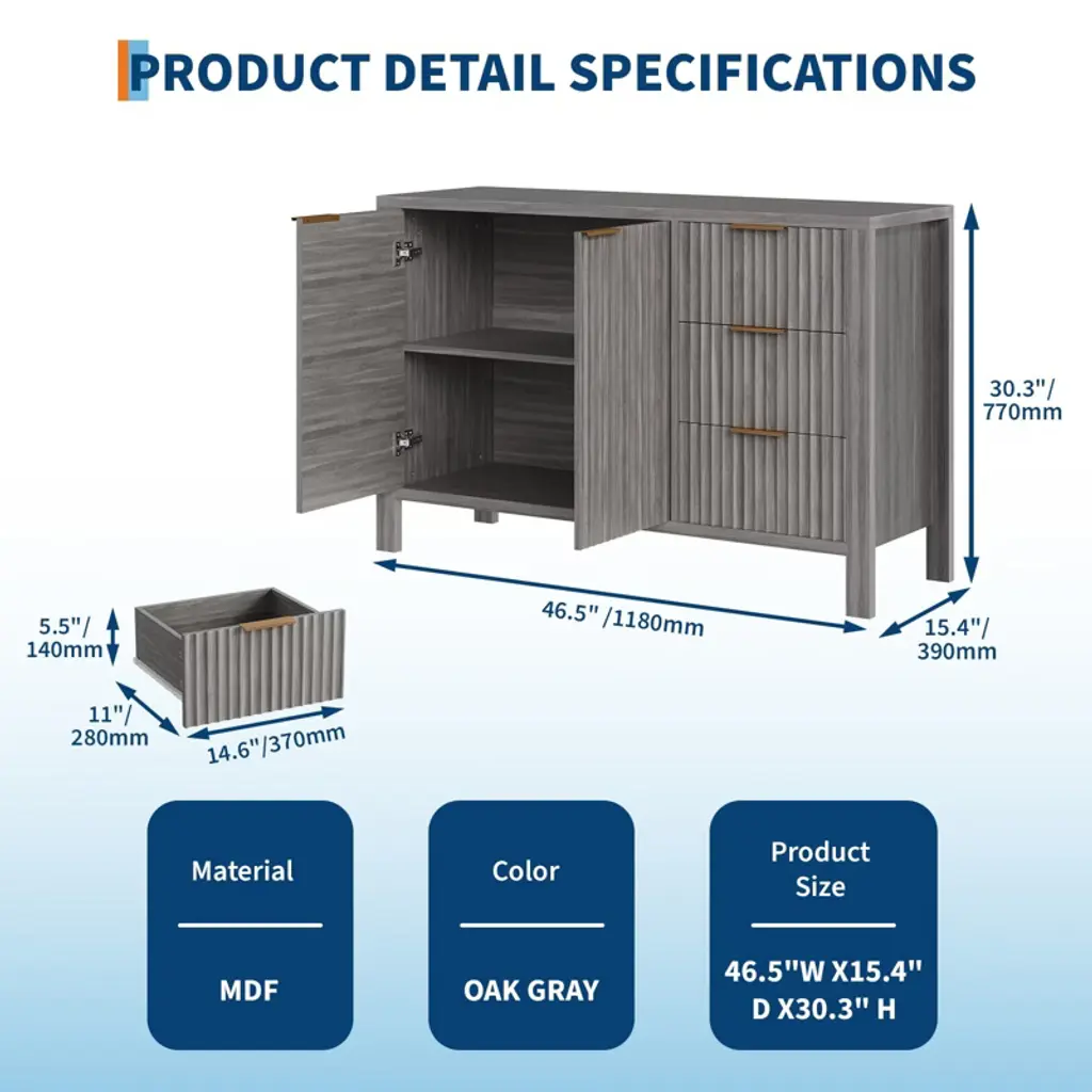 47" Fluted Storage Cabinet, Coffee Bar Console Cabinet With Adjustable Shelves, 3 Drawers & 2 Doors, For Living Room, Kitchen, Entryway