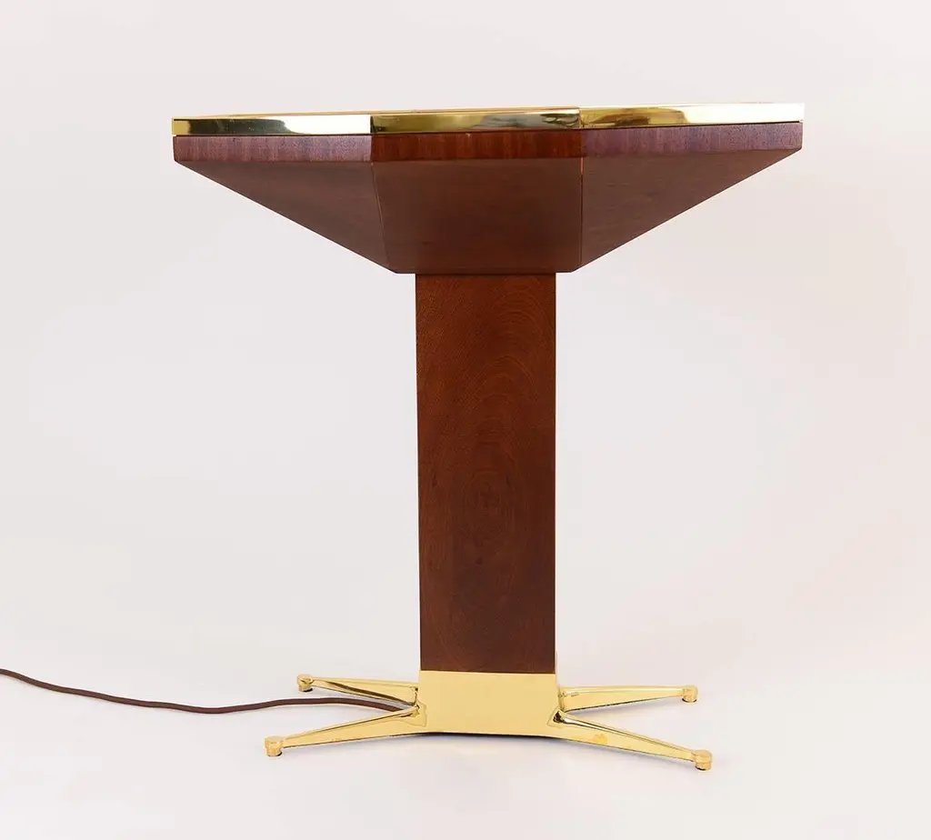Table designed for the famous Loos-American-Bar at the Kärntner Durchgang in Vienna. Sand casted brass-base, illuminated glass-tabletop.Now manufactured at the WOKA Workshop in Vienna.Material: Casted brass base, solid mahogany wood.