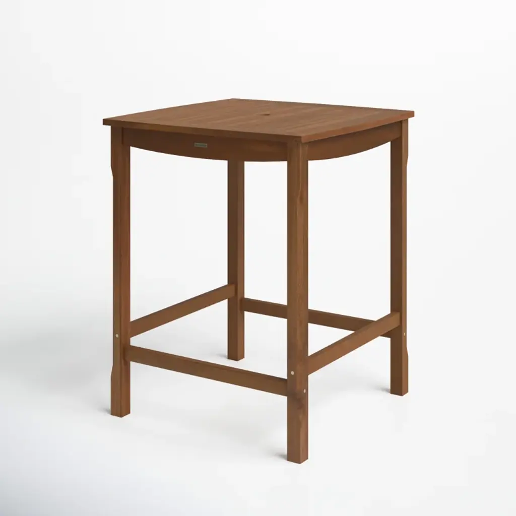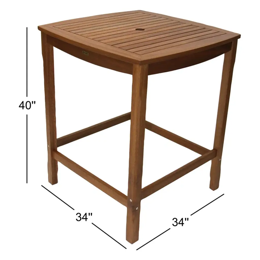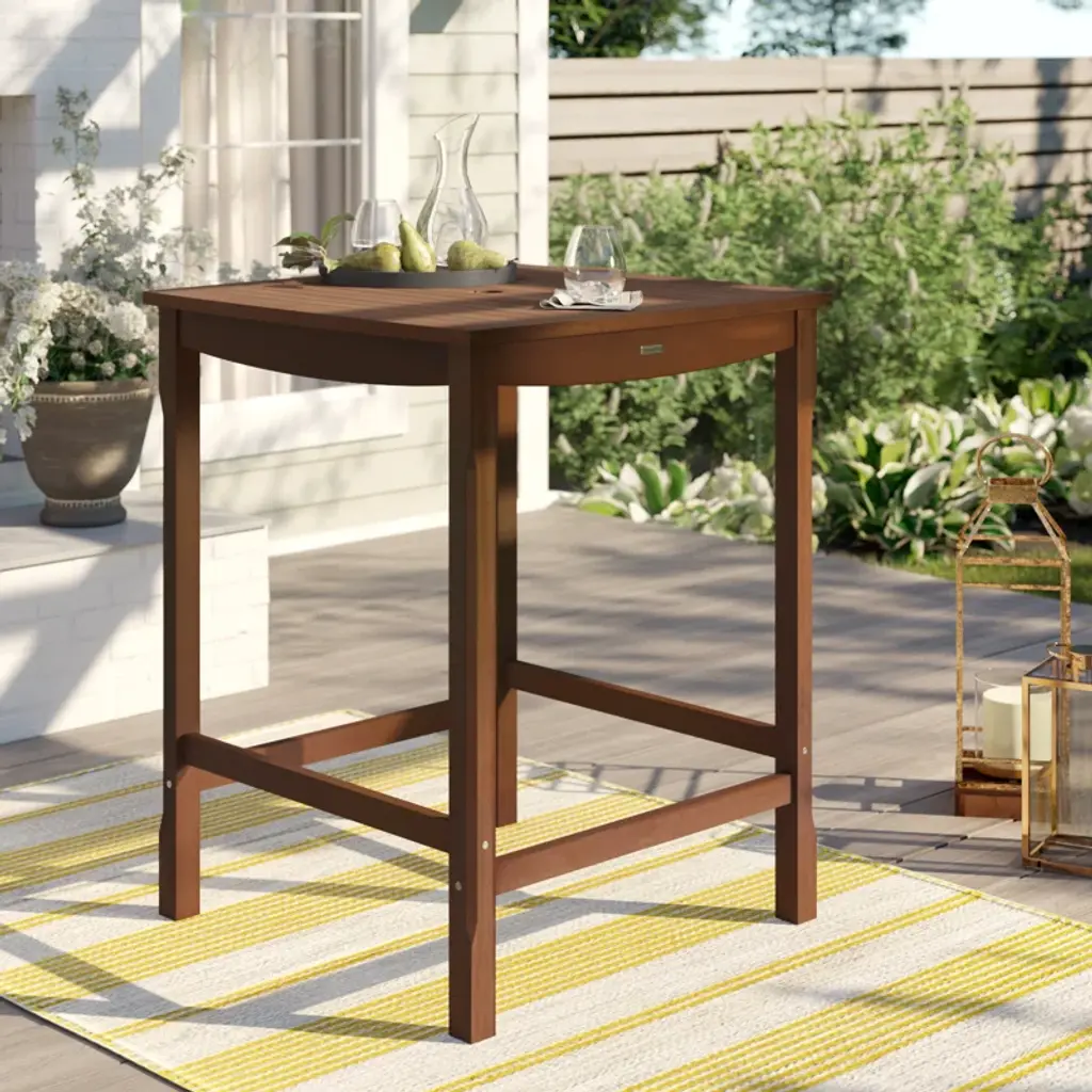This bar table is made from solid eucalyptus wood, which is a naturally weather- and mildew-resistant wood. It features a natural wood grain and warm brown tone that weathers to a beautiful gray patina with time – we recommend applying protective oil each season. This table has slatted details on its tabletop that allow water to run right through, and has an umbrella hole so you can add some optional shade. It's supported by four straight legs, and has four horizontal support bars that also serve as footrests while you're relaxing around the table on the weekend.