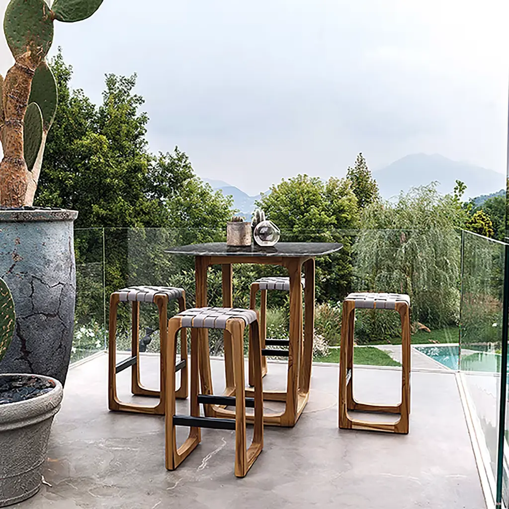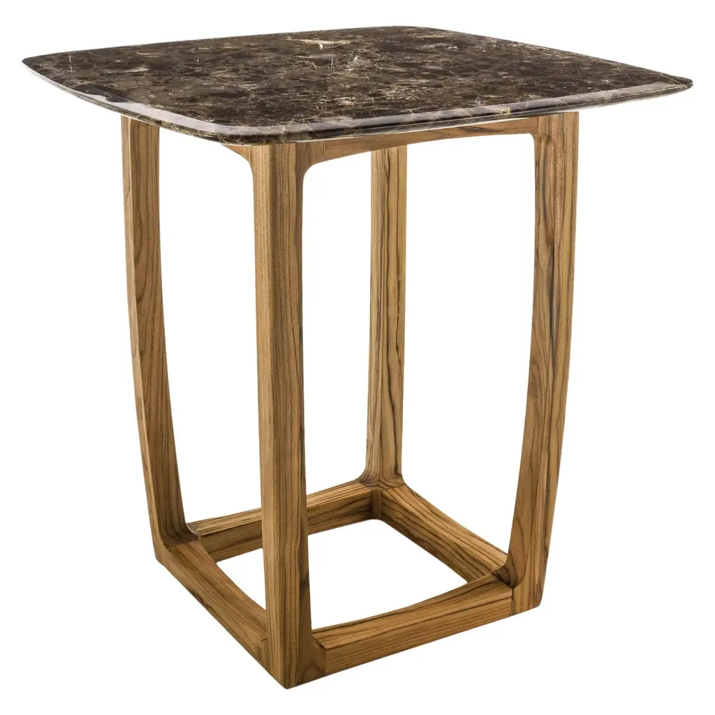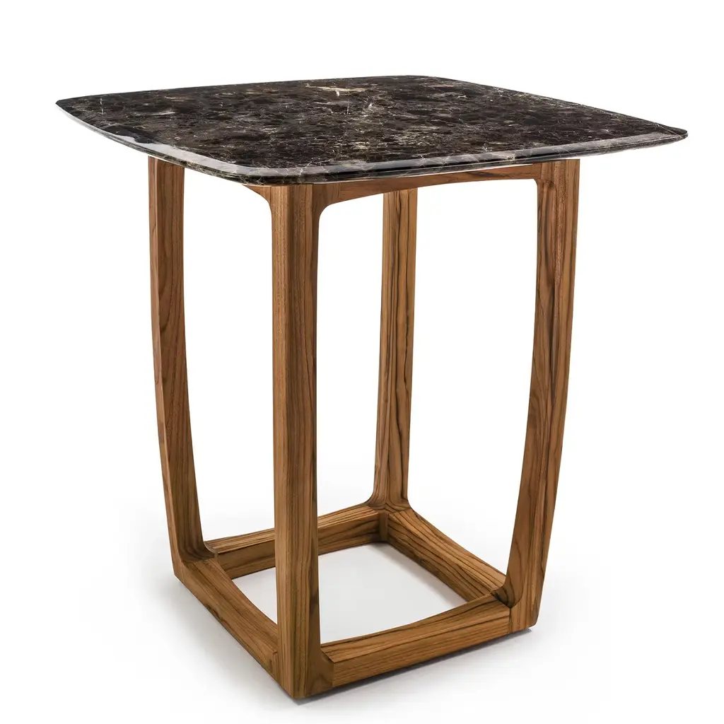 A design where every edge is traced for coupling impeccable stability and sculptural flair, this table in solid teak makes for an exquisite solution to set up a bar corner in refined private spaces. The prized Emperador Dark marble top features beveled edges, a detail that harmonizes with the slightly convex profile of the frame's vertical edges.