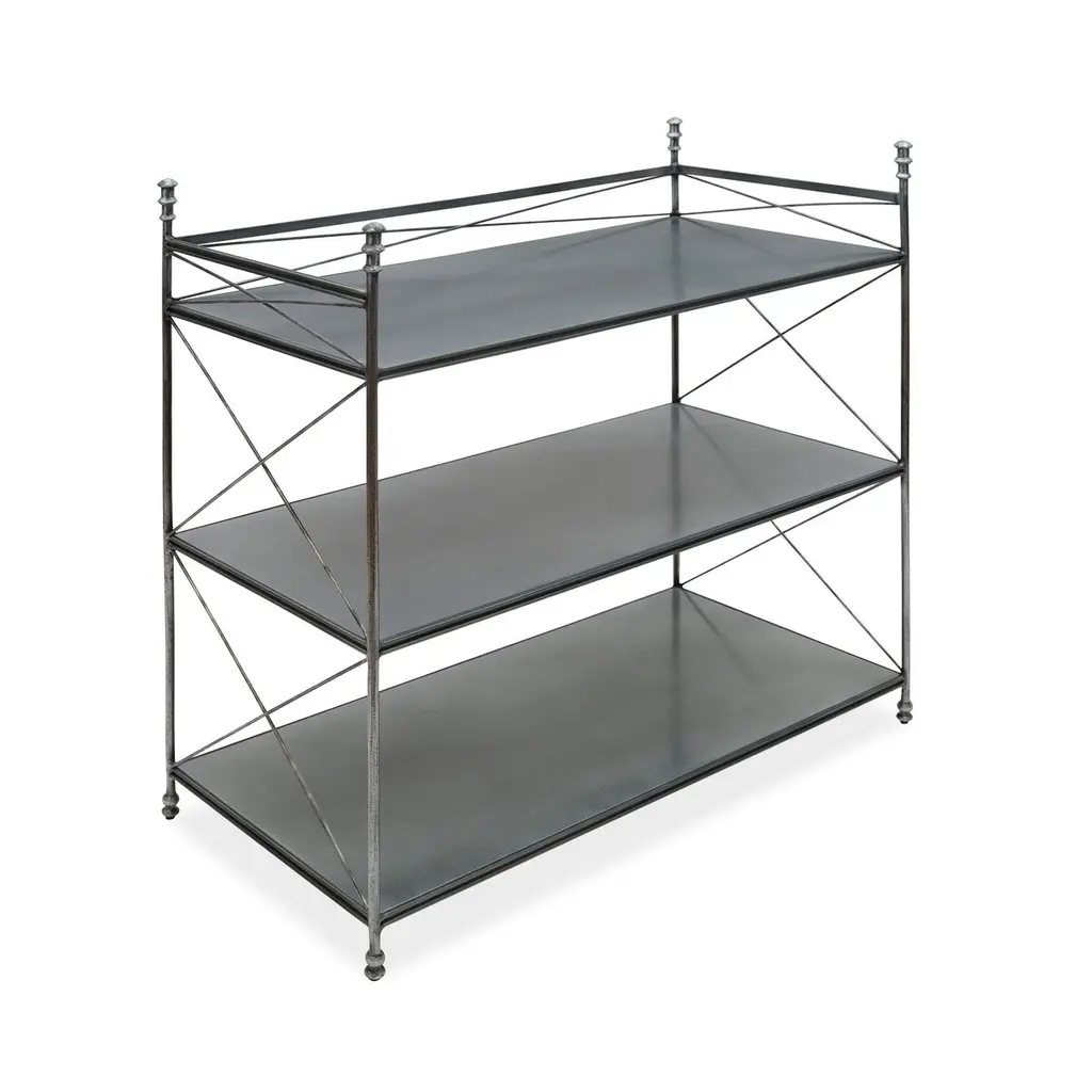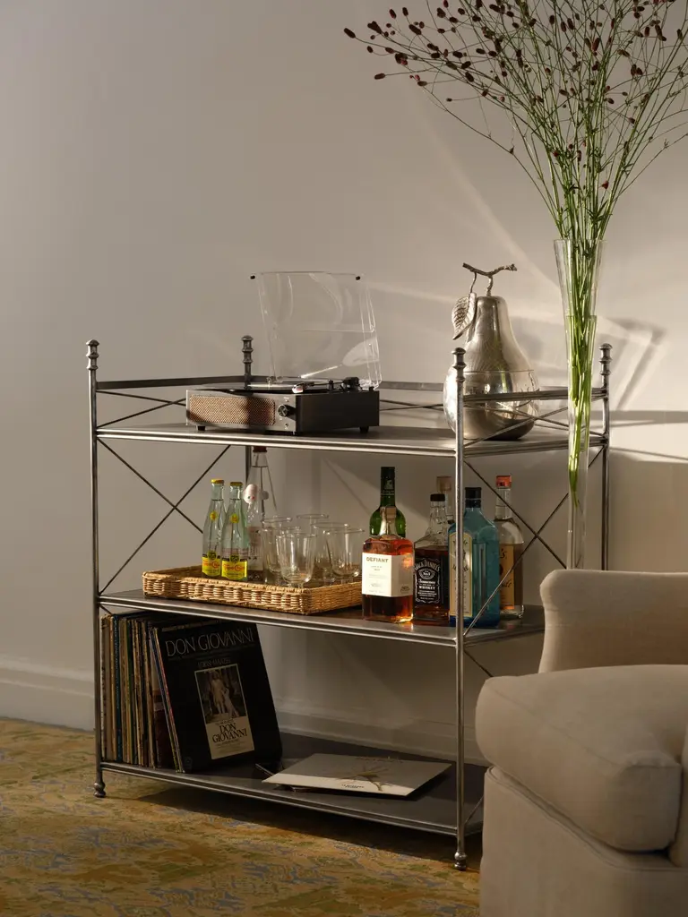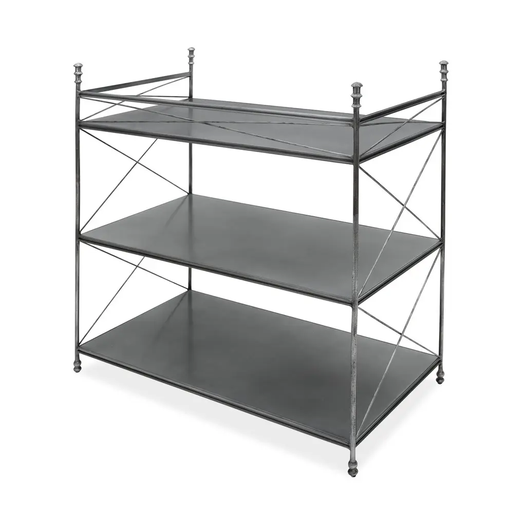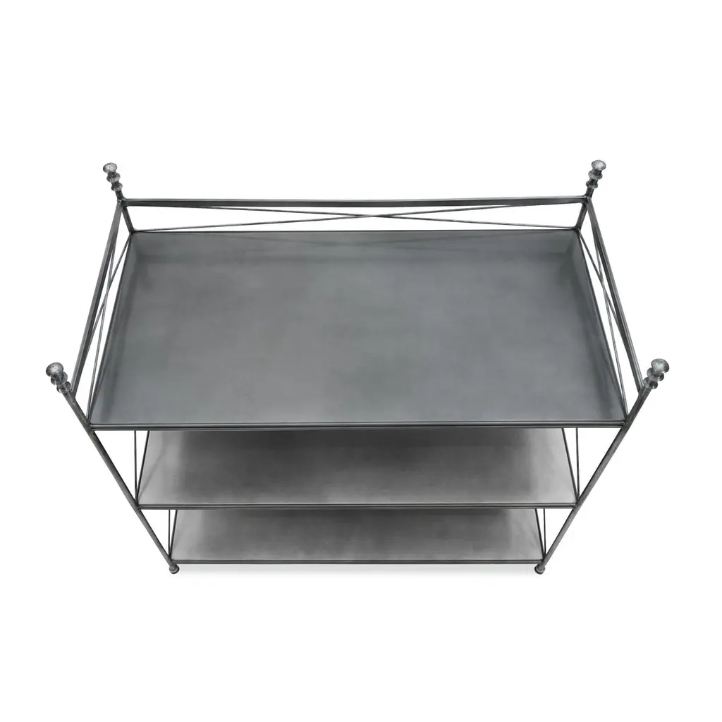 What do you call a waist-height table with three shelves?Well, many things! You could call it a Bar, with lots of storage for bourbon, bitters, and all the necessary bits for mixing a drink or three. But you might also call it a Butler’s Pantry (what mortals would term a Server) and let it hold extra dishes and cutlery alongside dinner. Others might call it a Music Table, ideal for holding your record player on top and records below. And certainly you’d not be mistaken for calling it an Occasional Table (a polite euphemism for Office table around here): dreamy when crowned with a legion of decorative objet or all your reference papers. We like to think any table can be an occasional table if you put your mind to it, but we digress. You might need two of these, as you can see its quite a useful table, whatever you call it.Cast aluminum with oil rubbed pewter finish.Dimensions: 39"H x 40"W x 20.5"DTop shelf: 32"HWeight: 28 lbs