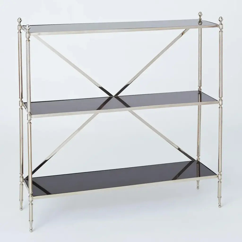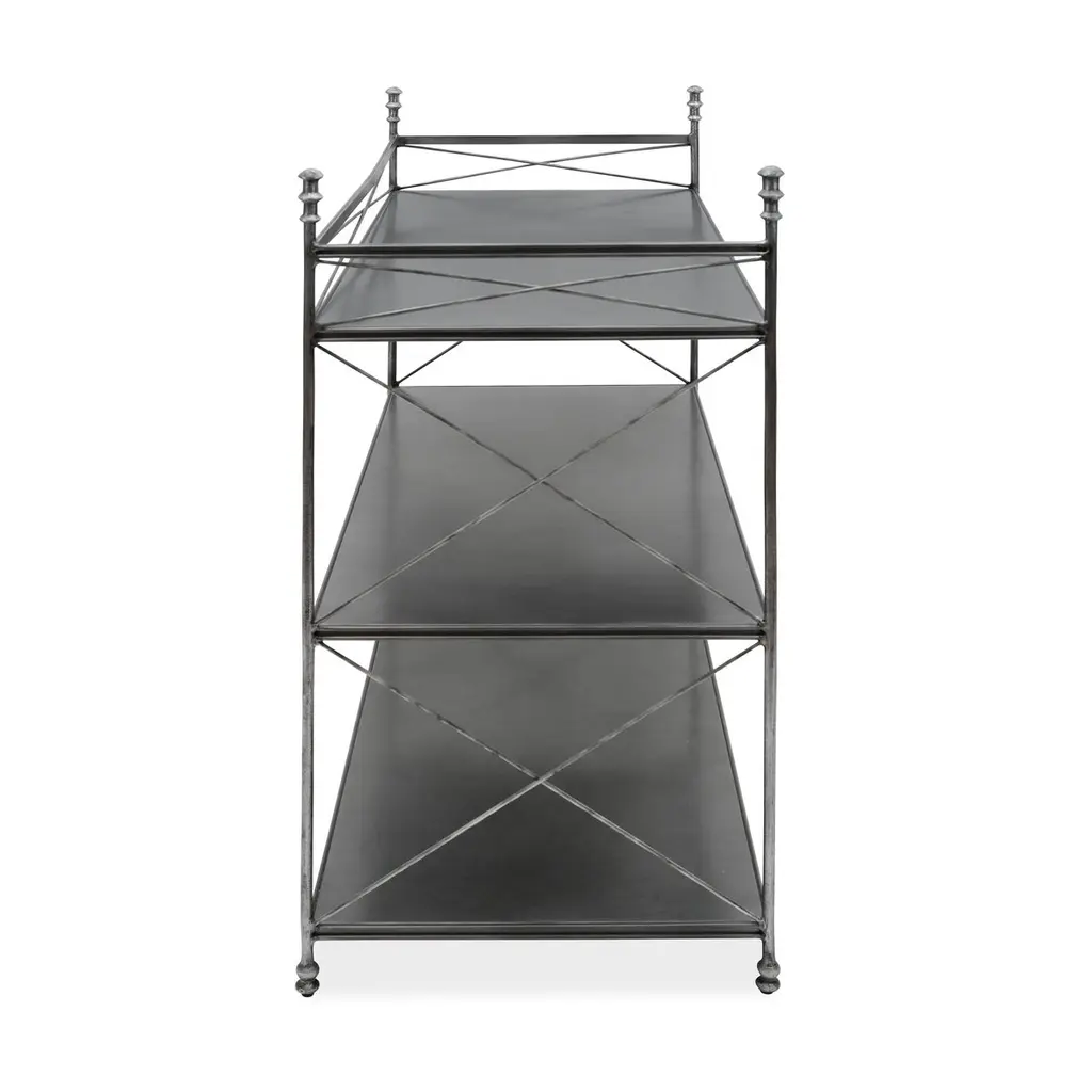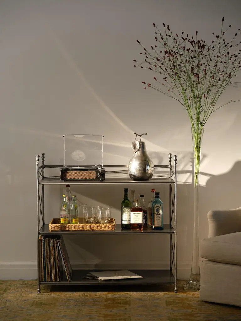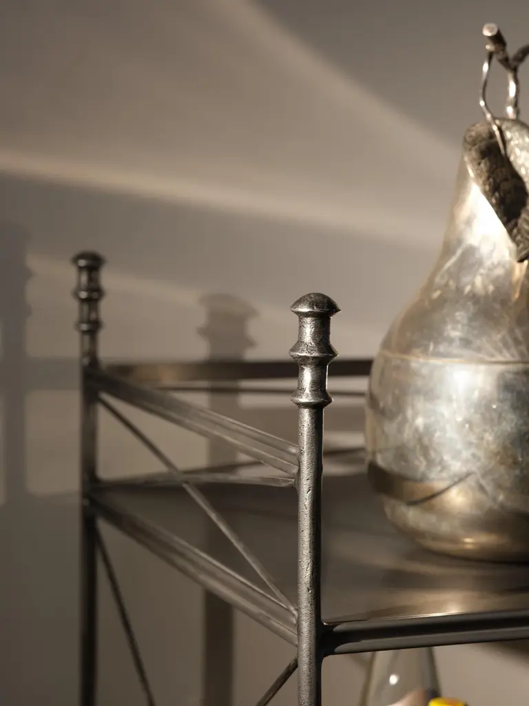What do you call a waist-height table with three shelves?Well, many things! You could call it a Bar, with lots of storage for bourbon, bitters, and all the necessary bits for mixing a drink or three. But you might also call it a Butler’s Pantry (what mortals would term a Server) and let it hold extra dishes and cutlery alongside dinner. Others might call it a Music Table, ideal for holding your record player on top and records below. And certainly you’d not be mistaken for calling it an Occasional Table (a polite euphemism for Office table around here): dreamy when crowned with a legion of decorative objet or all your reference papers. We like to think any table can be an occasional table if you put your mind to it, but we digress. You might need two of these, as you can see its quite a useful table, whatever you call it.Cast aluminum with oil rubbed pewter finish.Dimensions: 39"H x 40"W x 20.5"DTop shelf: 32"HWeight: 28 lbs