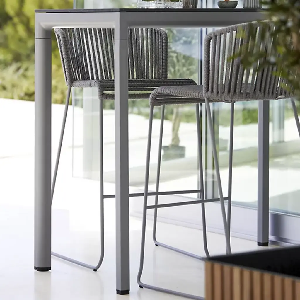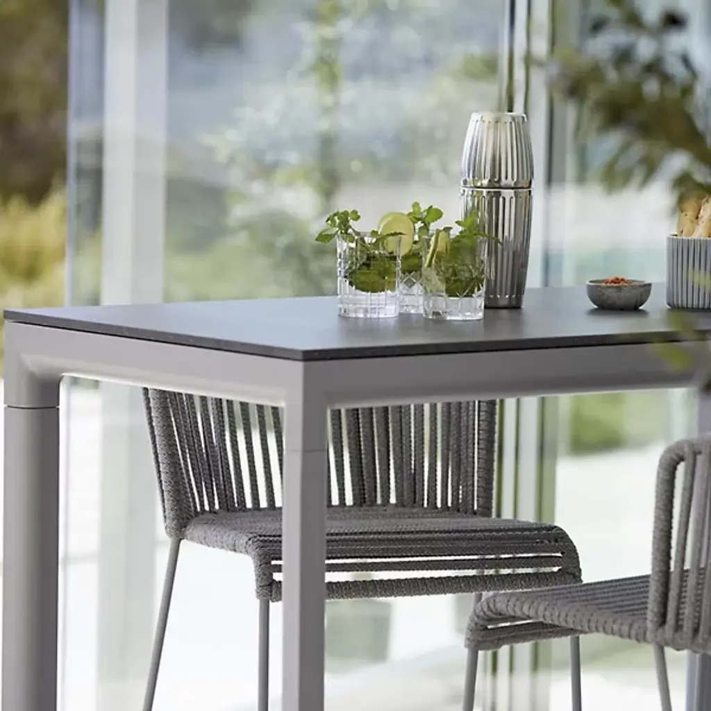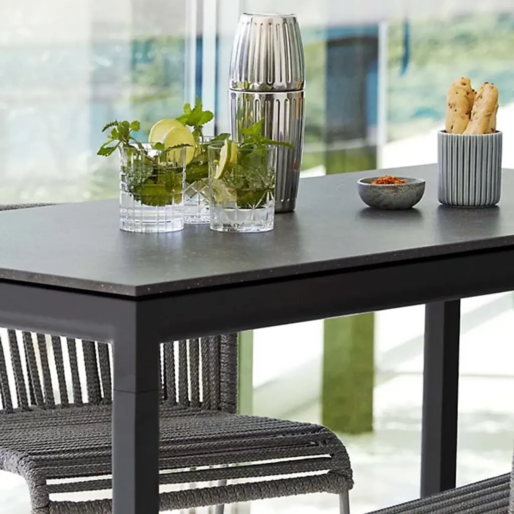 Meet the Drop Outdoor Bar Table from Cane-line, an expressive, open design where sleek aluminum frames meet chic tabletops for a contemporary outdoor aesthetic. Designed with a unique blend of angular, contoured table tops contrasting with softer shapes, it redefines outdoor elegance, creating an outdoor kitchen concept. The custom-designed aluminum profiles offer durability and sophistication, inspired by the graceful form of a water droplet, as it blends sharp edges with gentle curves, embodying contemporary and Scandinavian simplicity.