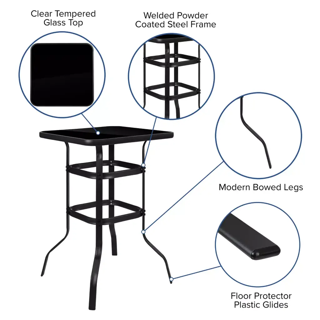 Flash Furniture Barker 27.5" Square Black Tempered Glass Bar Height Metal Patio Bar Table