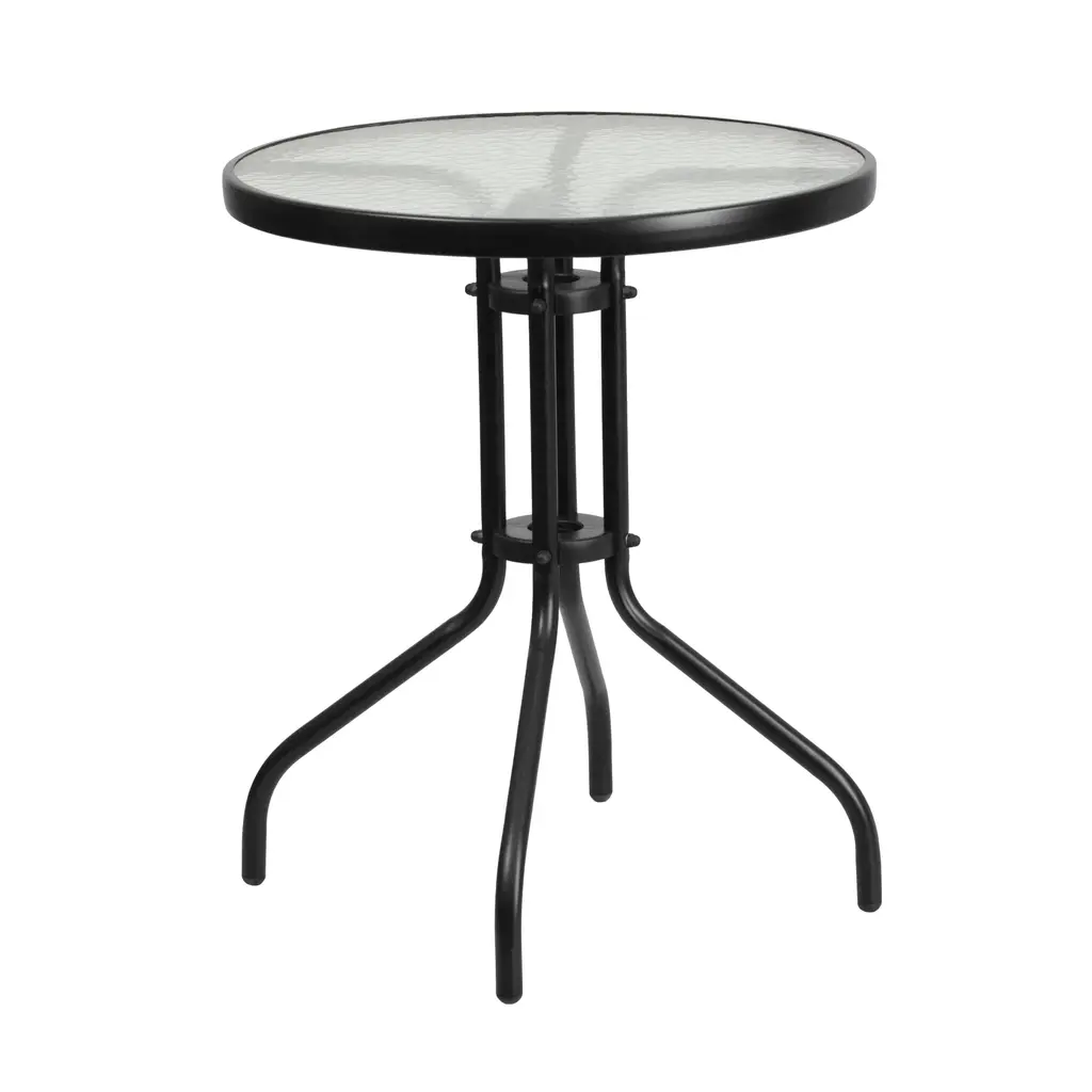 Every outdoor dining space needs a patio table, make it interesting with a bar height outdoor table. This svelte glass top dining table can be the center for conversation as well as hold the drinks for your BBQ. The outdoor bistro bar table has attractive bowed legs and glides that protect your flooring when used indoors. Welded frame adds durability and stability. After events the glass top table wipes down easily. Our 2 pack outdoor barstools with flex comfort material pair well with this bar table. Whether in your backyard, deck, or outdoor dining space, you'll enjoy this bar height table sitting down with a drink or while standing have a lighthearted conversation.