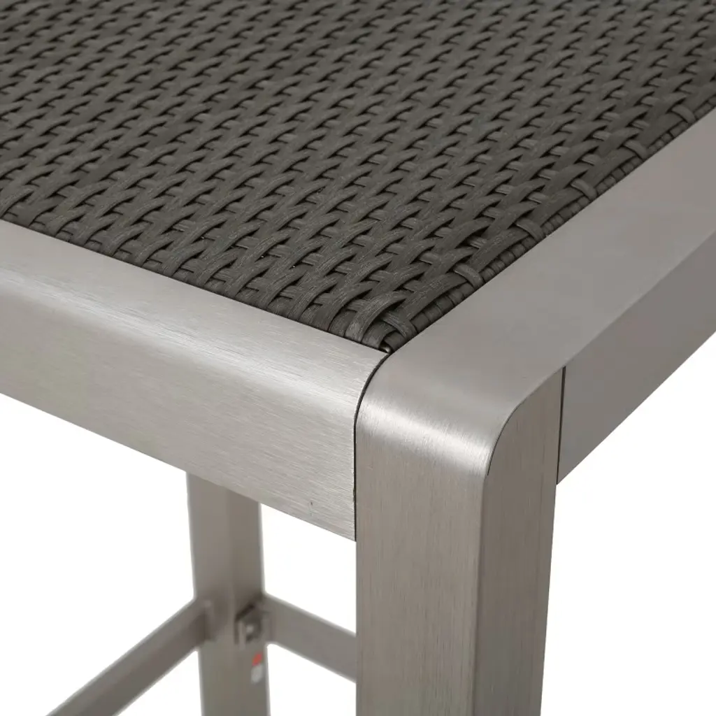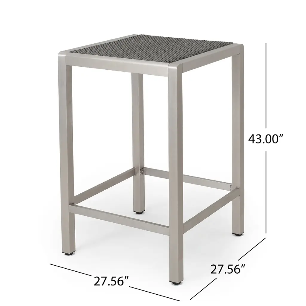 Upgrade your patio or backyard with this modern outdoor bar-height table, featuring a durable faux rattan top and a lightweight yet sturdy aluminum H-frame. The gray wicker weave offers a contemporary look while resisting weather damage, ensuring year-round usability. At 43 inches high, it provides the perfect surface for drinks, snacks, or décor, pairing effortlessly with bar stools for elevated entertaining. Compact in size yet generously functional, this table fits seamlessly into patios, decks, or balconies. Easy to assemble and designed for the outdoors, it blends style, stability, and practicality in one sleek piece. Material: Faux Rattan Frame Material: Aluminum Finish: Gray Assembly Required Dimensions: 27.56 inches deep x 27.56 inches wide x 43 inches high