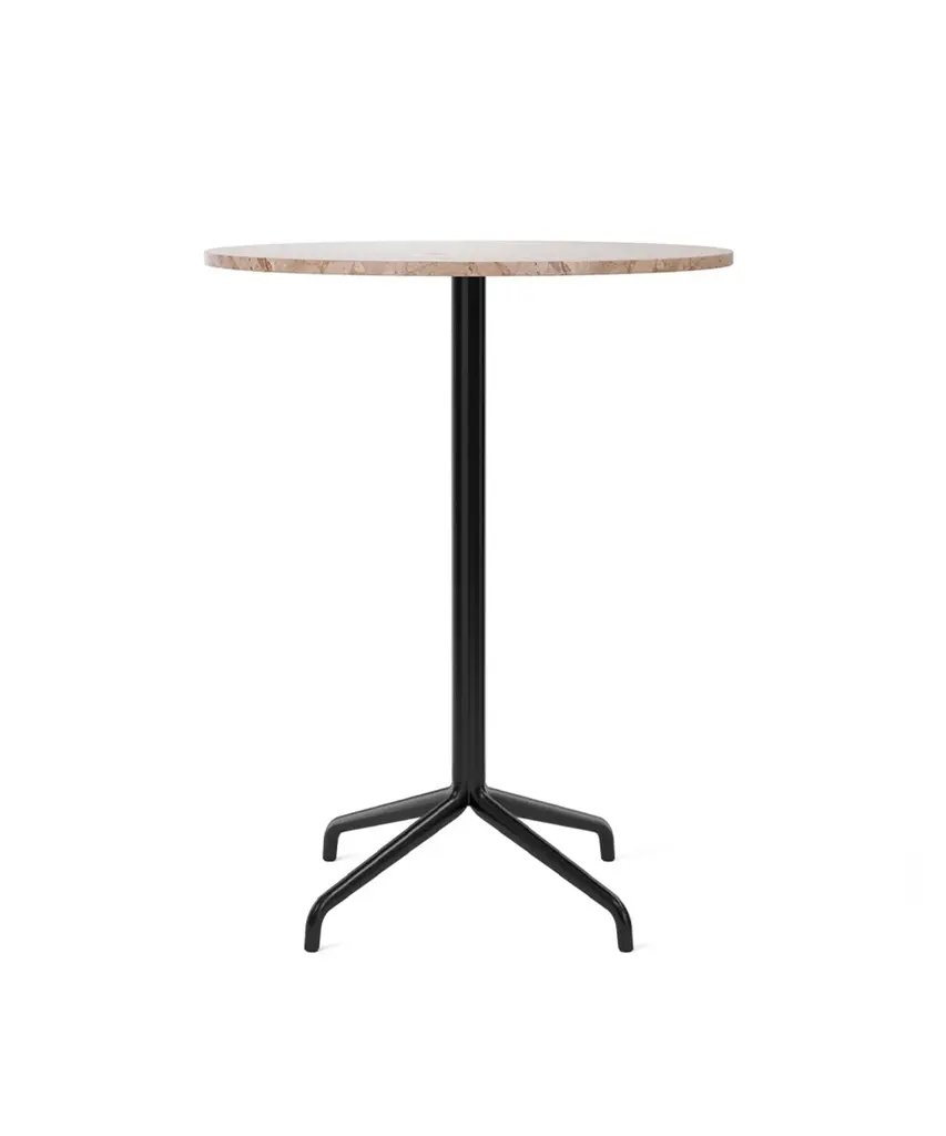 Audo Copenhagen's column table gets a convivial round tabletop in a choice of refined stone, tactile wood veneer or smooth linoleum in these bar and counter versions. Harbour’s clover-shaped column base lends a refined air to the kitchen or den, with a choice of a round disc footing or a 4-star configuration in powder-coated steel.