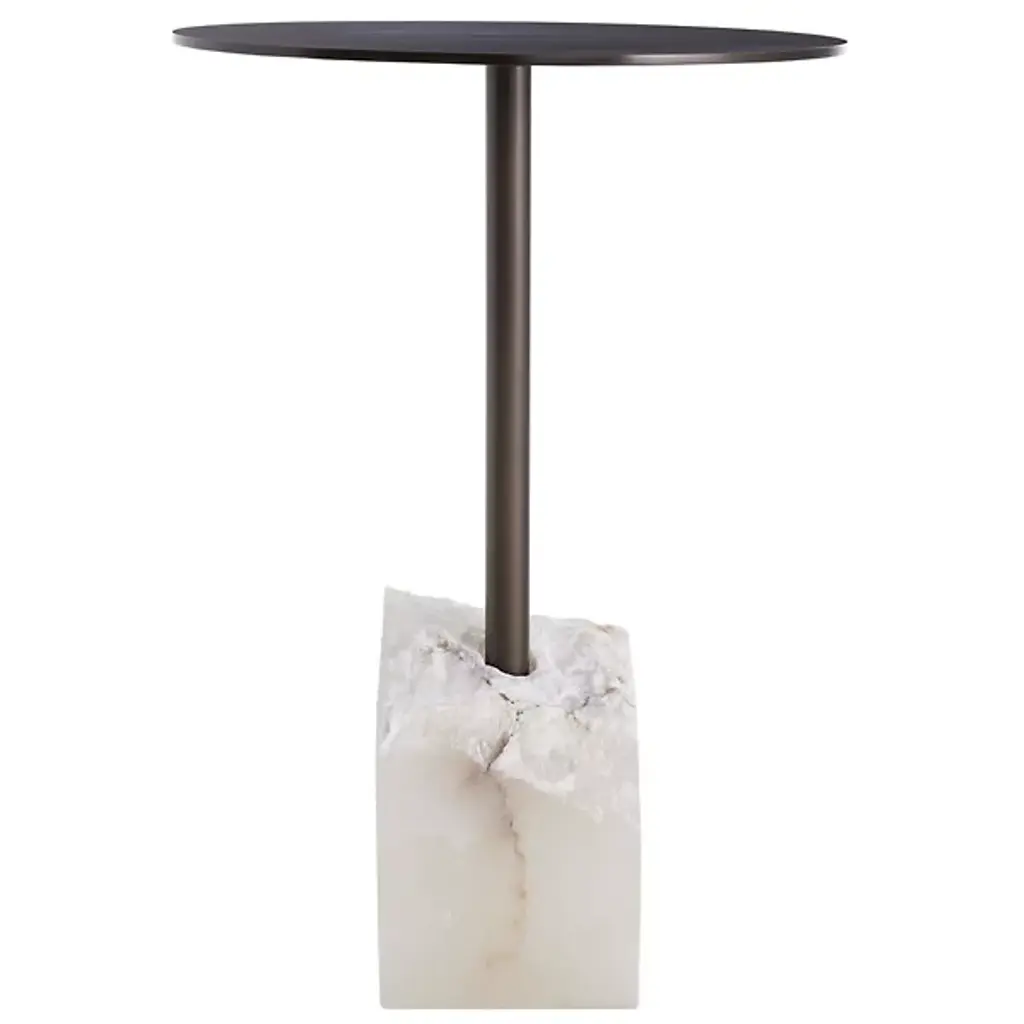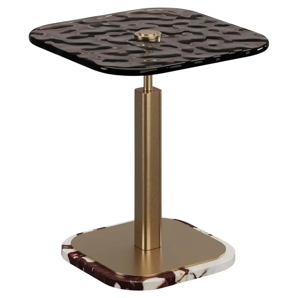 Add a touch of opulence to any space with this spectacular bar table. Features a brushed antique brass frame with mesh patterning on the tabletop. Completed with a grey marble block base. Also available in white marble. Made in India. With refined craftsmanship, this design was brought to life by skilled local artisans. By nature, these materials develop unique imperfections such as fissures, markings and colour variations for a truly one-of-a-kind piece.