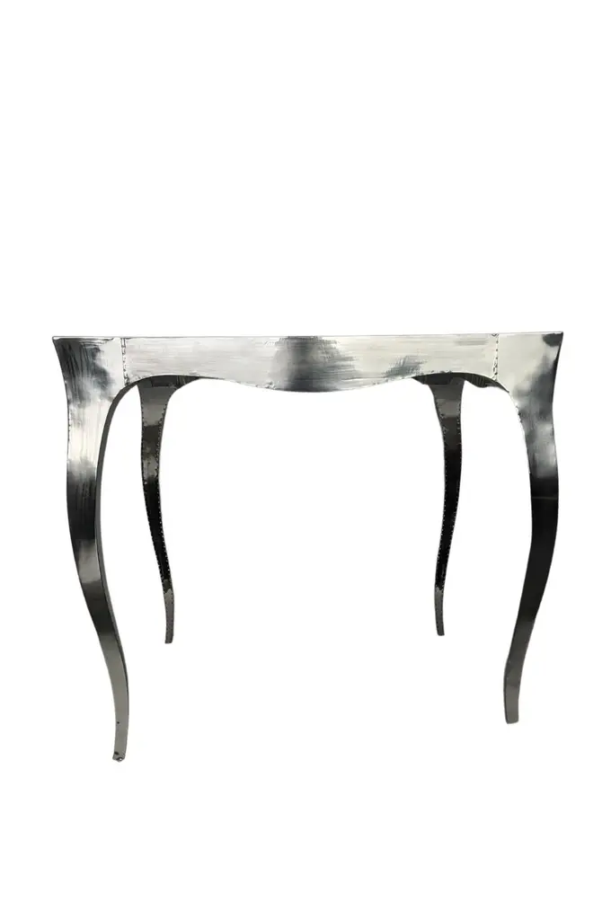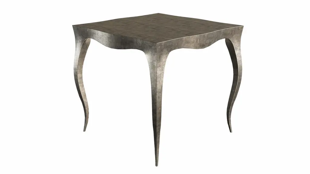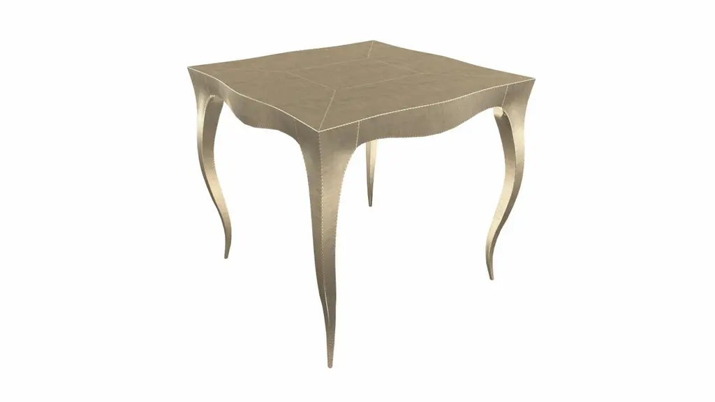 Louis Card Tables from our Louise Collection. The renowned designer Paul Mathieu chose the name “Louise” when he created his more feminine version of Louis XV (1730-1760) furniture. The characteristic cabriole leg, curving outward at the knee and inward towards the foot in an "S" shape was born during this period. It is during the same era that English furniture makers produced the Queen Anne and Chippendale styles.Crafted with utmost care and attention to detail, these Louis Card Tables are made to order and are available in twelve metal clad finishes, ensuring that you can choose the perfect one to match your individual style and taste. The use of high-quality materials and expert craftsmanship ensure that each Art Deco Louis Card Tables is not only beautiful but also a true piece of art.The curved legs and side arms of this Art Deco Louis Card Tables are hand carved from solid pieces of teak. Pattern makers trace and cut complex forms that will cover the chair in a skin of copper, white bronze, brass or antiqued white bronze The metal finishes will tarnish over time. Regular non-abrasive household metal polishes can be used to restore the original luster.Overall, if you're looking for a piece of furniture that combines luxury, comfort, and style, then the Art Deco Card Tables is an excellent choice. With its distinctive curved profile and multiple finish options, this Chair set is sure to elevate the look of any room it is placed in, and be a beloved addition to your home for years to come.The images shown in this listing are shot in different lighting conditions and/or are 3D illustrations. We encourage our customers to please request a sample or a full sample set of 12 finishes so that they can experience the finish first hand. Louise Art Deco CArts and Bar CArts Table Mid. Hammered Brass by Paul Mathieu for Stephanie OdegardSize- 32"x 32"x 30"HMaterials - White Bronze, Metal sheet, Teak, Wood, MetalTechniques: Hand-Crafted, Hand-Carved, Metal Work, Wood Work, Metal Wrapping, PolishedPlease note that moisture in air, sudden change in temperature and natural movement of wood over time causes the metal to wrinkle or bubble up. We use well seasoned, reclaimed teak and high quality marine grade MDF (wherever technically possible) to avoid and delay the mentioned changes. However a perfect stability of metal cannot be guaranteed. Please note that our smooth finish metal clad pieces will have some unavoidable tool marks. This is proof that everything is done by hand. The smooth finish will not come out like a machine made perfect surface and the master artisan will do their best to make it look as good/clean/stable/perfect as he possibly can.The antique white bronze finish is hand done by using an acidic chemical over the white bronze finish to recreate a natural patination. Like with the natural patination of silver, copper, or brass, the final result and color uniformity of the patina cannot be guaranteed. The goal of this finish is to achieve rainbow-like shades with dull, shiny, cloudy, and streaky patches to give an illusion of antiquing. Please note:None of our metal clad pieces are treated with a protective “finish” thus enabling the items to age naturally over time. We will of course polish them well before we pack them. a) Copper oxidizes faster than the other metals. In six to twelve months it will most likely lose its shine and will gradually turn to different shades of brown and/or green/blue. This aging process and its effect is referred to as verdigris. After a year the piece should not change much more. Copper does not rust, but does require periodic cleaning in order to retain its original shine if that the preferred option. ('BRASSO' or any known copper polish can be used to polish copper).b) Brass retains its shine for far longer than others, but will tarnish if not cleaned on occasion. ('BRASSO' is made to polish brass).c) White bronze, has the least tendency to show age or tarnish. If kept in a controlled climate, this metal will hold its shine for years. It can be cleaned with a cleanser and polished with a cloth. d) The antiqued white bronze finish will react with the natural elements the fastest in the beginning but it too will stop reacting and will settle down in a stable state like copper after 6-12 months. Since it is already antiqued and looked like it is tarnished, as described in an earlier message, this fast reaction will not change the over all look. In that way this surface is most forgiving. The images shown in this listing are shot in different lighting conditions and/or are 3D illustrations. We encourage our customers to please request a sample or a full sample set of 12 finishes so that they can experience the finish first hand.