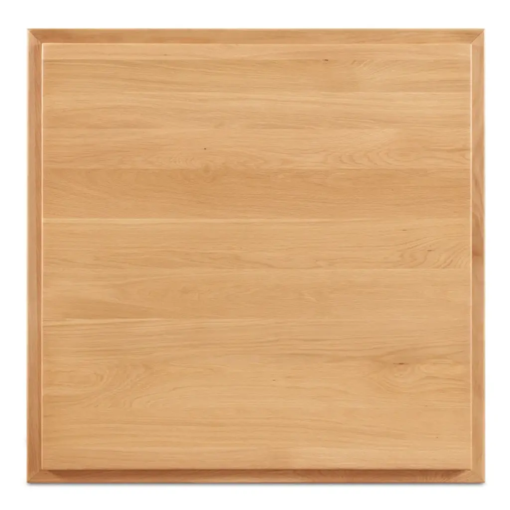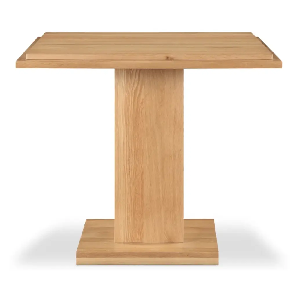 The May bar table's unique double square top and rectangular post leg create an intriguing visual harmony. Crafted from solid oak, the table exudes warmth and natural beauty. Subtle curves and angled edges offer ergonomic comfort, inviting lingering moments, effortlessly transitioning from cafe table to entryway accent.