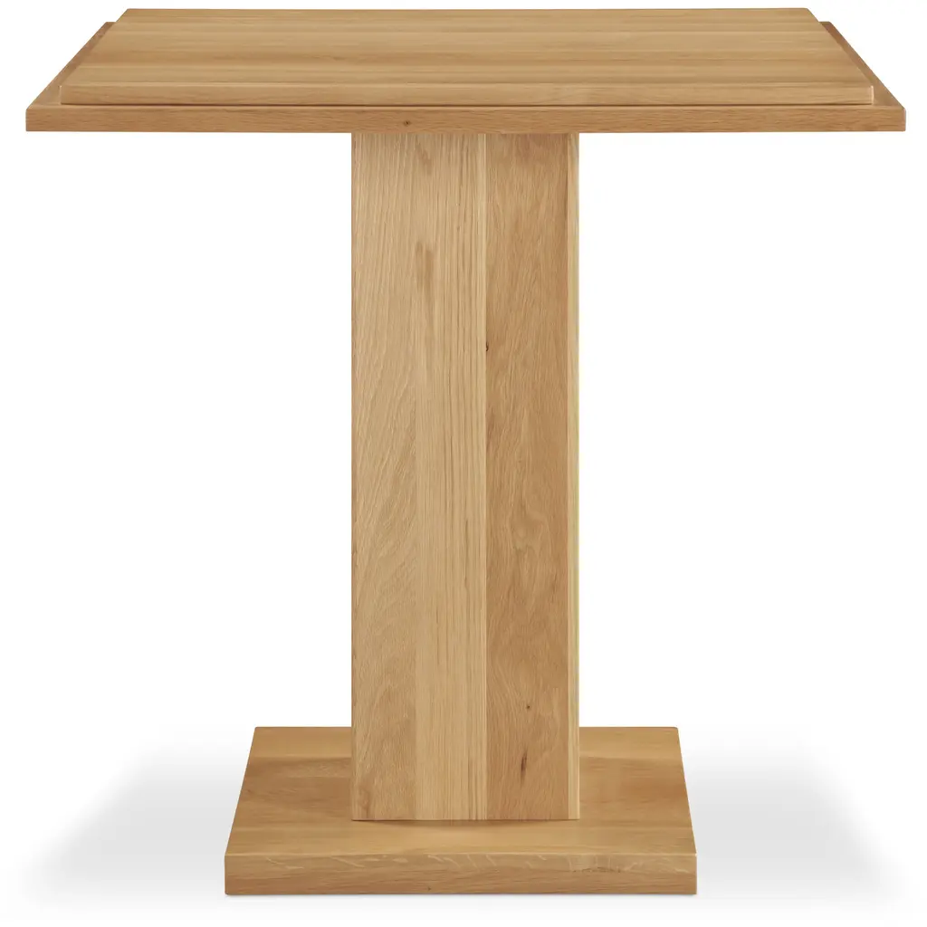 The May bar table's unique double square top and rectangular post leg create an intriguing visual harmony. Crafted from solid oak, the table exudes warmth and natural beauty. Subtle curves and angled edges offer ergonomic comfort, inviting lingering moments, effortlessly transitioning from cafe table to entryway accent.